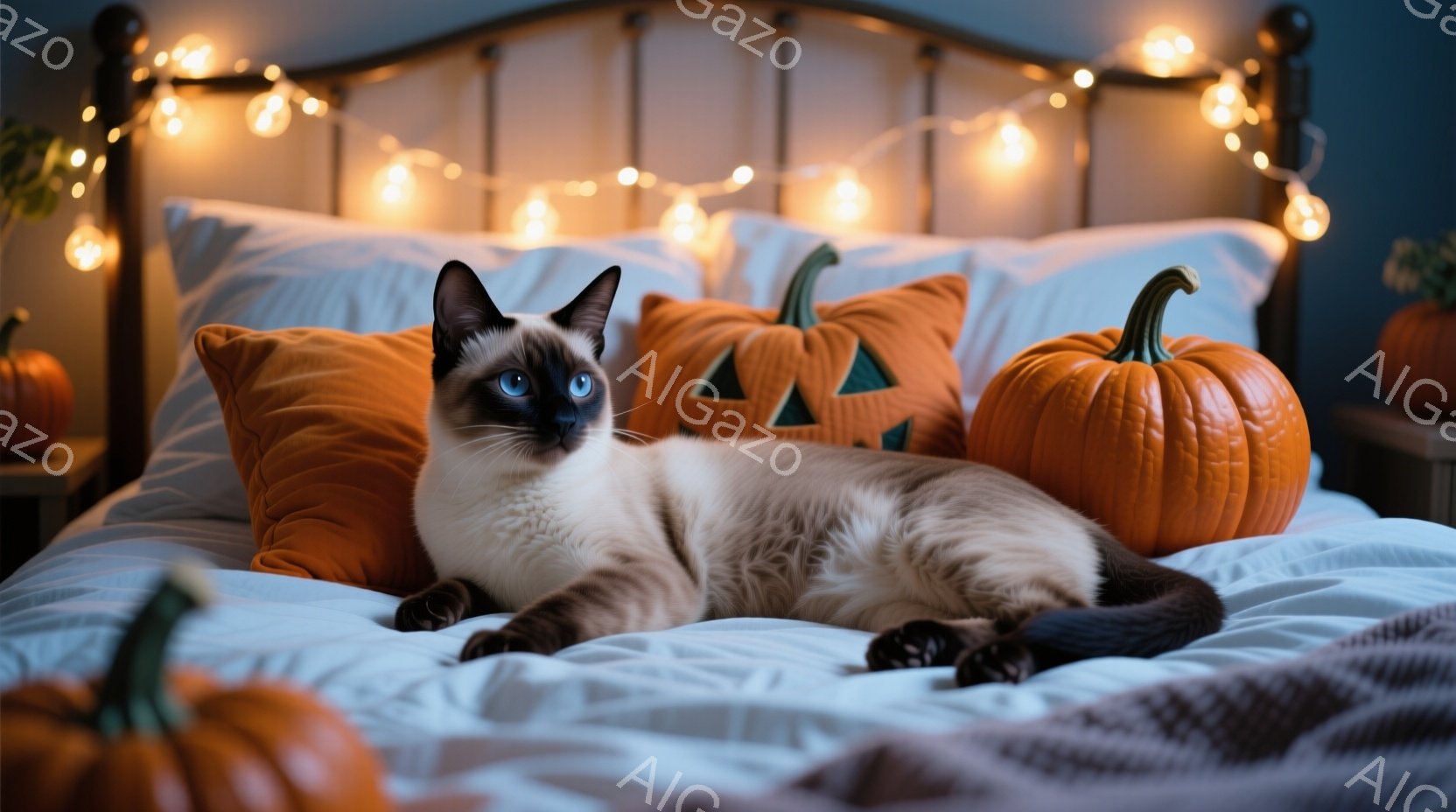 この無料AI生成画像「シーロの猫がハロウィーンの衣装を着て座っています。紺色に金の星が散りばめられたマントと、先の尖った黒い帽子を身につけています。背景には、様々な大きさのジャック・オー・ランタンが並び、暗い森と夜空が広がっており、ハロウィーンの雰囲気を醸し出しています。」は、2025年10月25日に作成されました。 サイズは 1664×928px の高解像度で、商用利用も可能なフリー素材として提供しています。