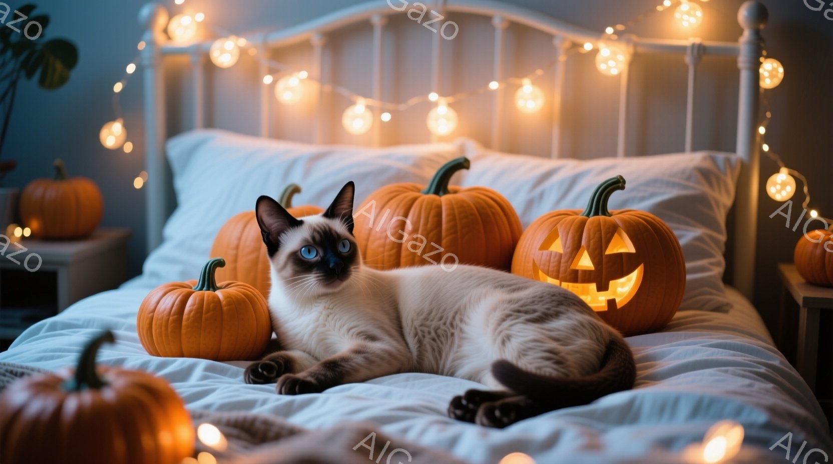 シーマル猫がベッドの上でリラックスして横たわっています。周りにはハロウィーンの飾りであるジャック・オー・ランタンのクッションとカボチャが置かれ、ベッドのヘッドボードにはオレンジ色のイルミネーションが飾られています。全体的に暖かく、お祝いムードに満ちた秋の雰囲気です。