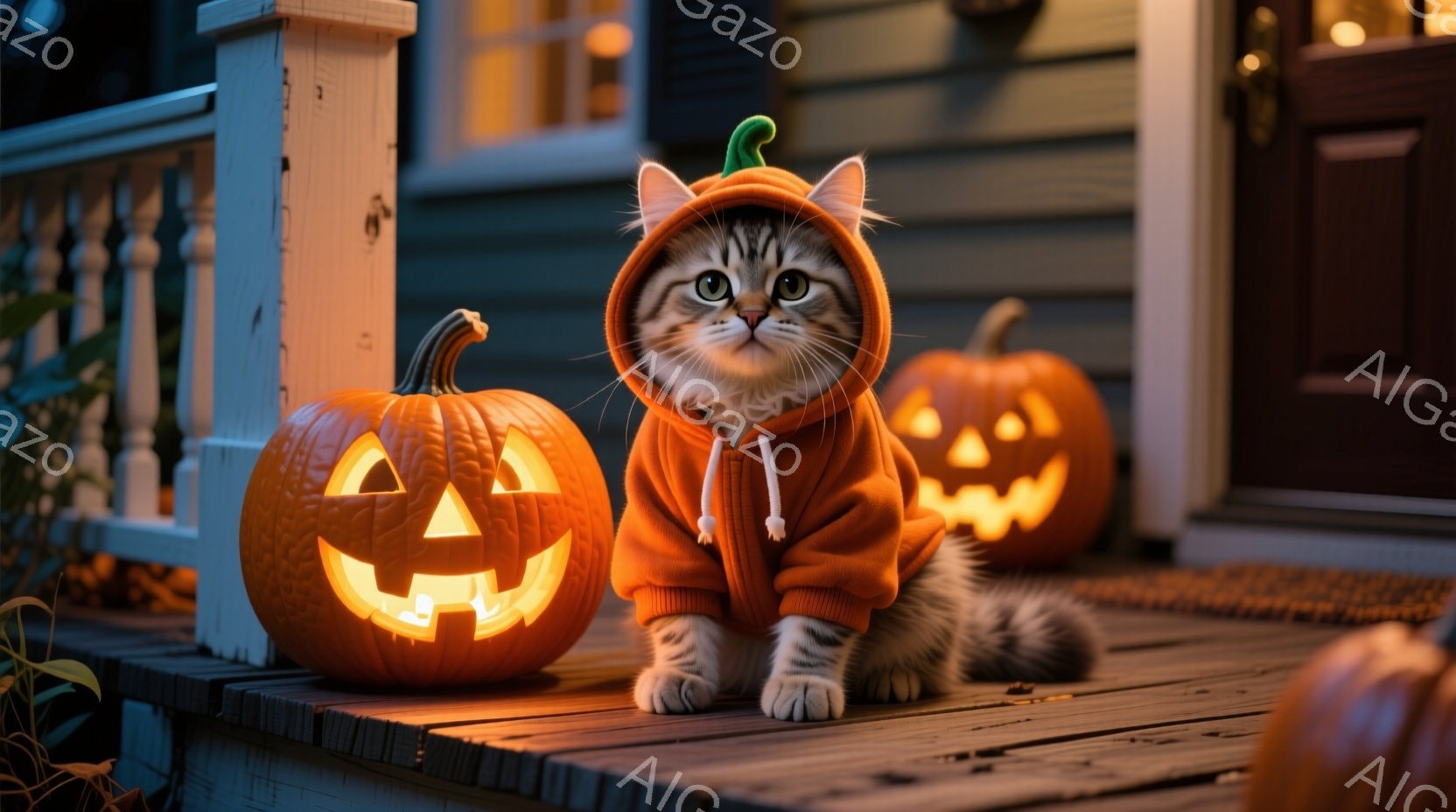 白と灰色の毛並みを持つ子猫が、オレンジ色のハロウィン風のパーカーを着て、木製のデッキに座っています。周囲には3つのジャック・オー・ランタンが置かれ、暖かく明るい光を放っています。背景には暗い青色の壁と、ぼんやりとした室内からの光があり、ハロウィーンの夜の静かで楽しい雰囲気を醸し出しています。