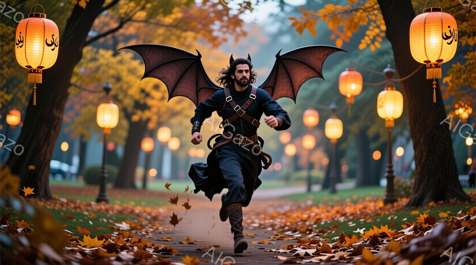 黒いドレスと翼を身につけた女性が公園の小道で走っている。彼女は黒髪をなびかせ、真剣な表情で前を見つめている。背景には黄色の葉が散りばめられた道、そして夕暮れ時の街路樹と提灯が並び、ハロウィーンの雰囲気を醸し出している。
