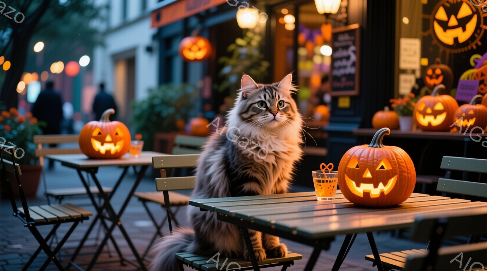 縞模様の猫が屋外カフェのテーブルに座っており、オレンジ色のジャックオーランタンがテーブルの上と周囲に配置されている。猫は正面を見据え、穏やかでリラックスした表情をしている。背景には、ハロウィーンの飾り付けが施されたカフェの建物があり、暖かい光が灯り、秋の夜の雰囲気を醸し出している。