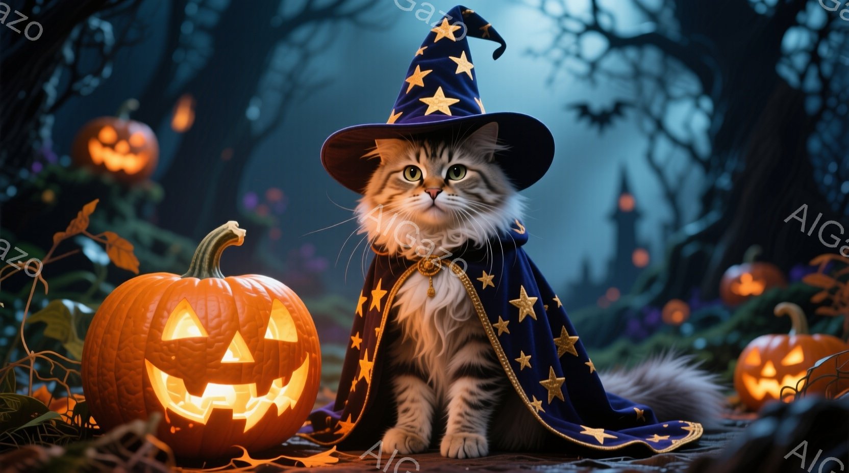 白い毛並みの猫が、星が散りばめられた青いマントと魔女帽子を身に着け、まるで小さな魔法使いのようです。猫は正面をまっすぐ見ており、どこか自信に満ちた表情をしています。背景には、ハロウィーンの象徴であるジャック・オ・ランタンや、薄暗い森が広がっており、神秘的で幻想的な雰囲気を醸し出しています。