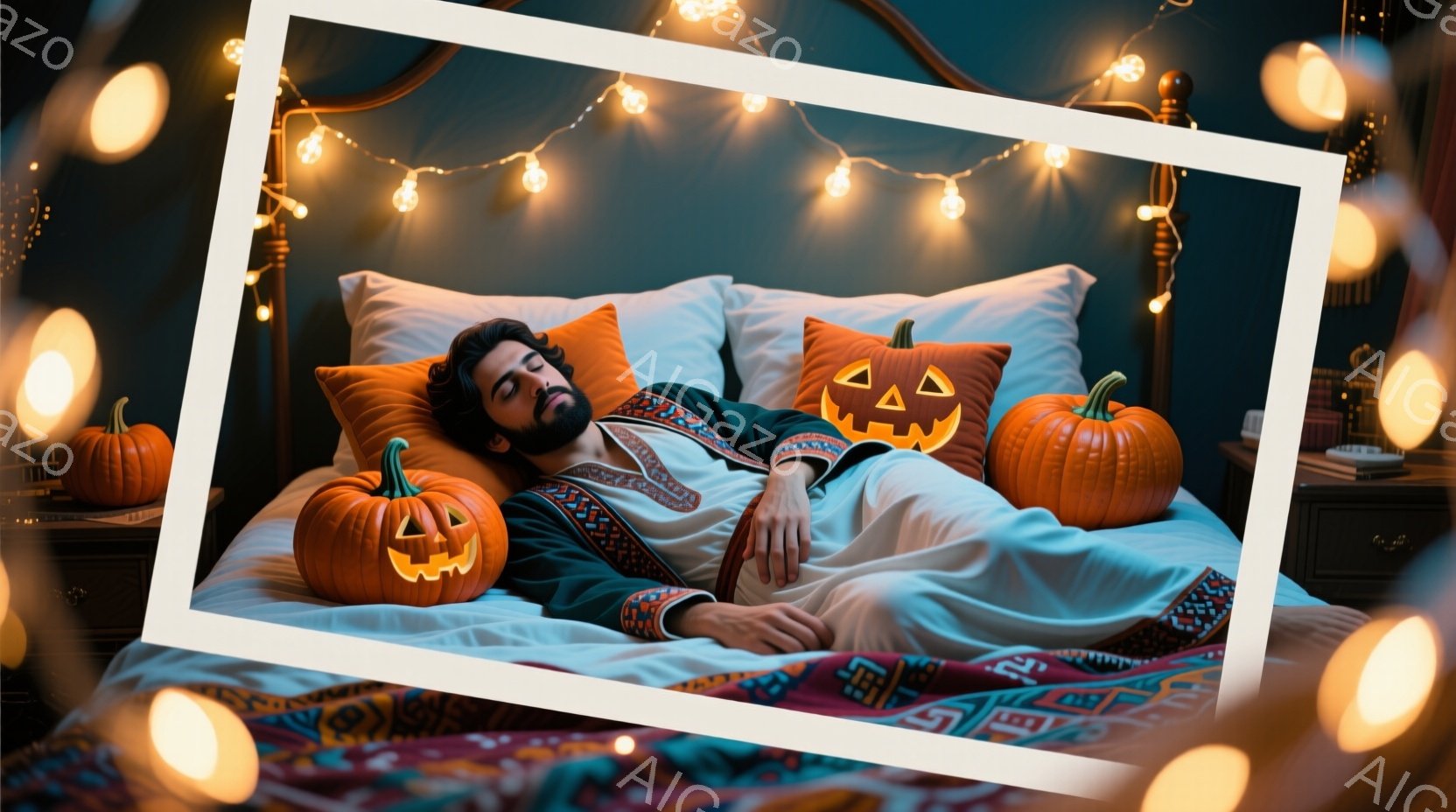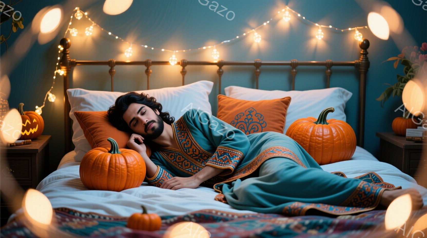 長い巻き毛の男性がベッドで眠っており、クリーム色のパジャマを着ています。背景にはハロウィーンの飾り付け、特に様々な大きさのジャック・オー・ランタンと電飾があり、温かみのあるオレンジと明るい光が印象的です。部屋全体は秋らしい雰囲気で、心地よくリラックスした空間を表現しています。