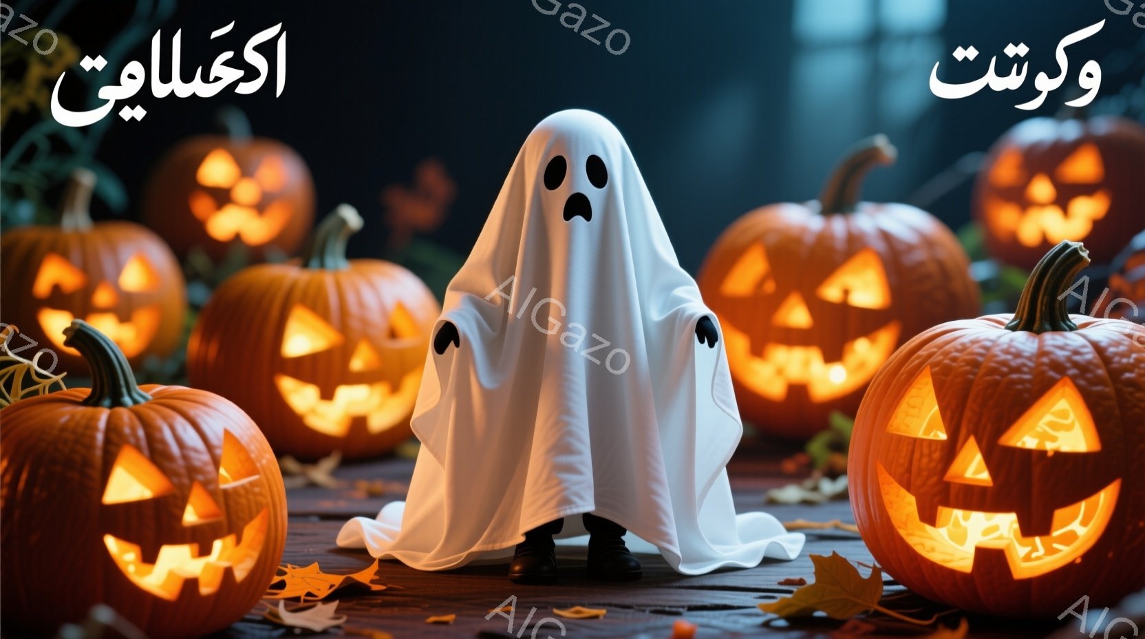 教室にはハロウィーンの飾り付けが至る所に施されており、カボチャやお化け、黒猫のモチーフが目を引きます。女性教師は整った髪型で、真剣な表情で机に向かい、何かを書き込んでいます。教室には生徒の机が並び、それぞれの机の上にもカボチャが置かれており、ハロウィーンの楽しい雰囲気を演出しています。