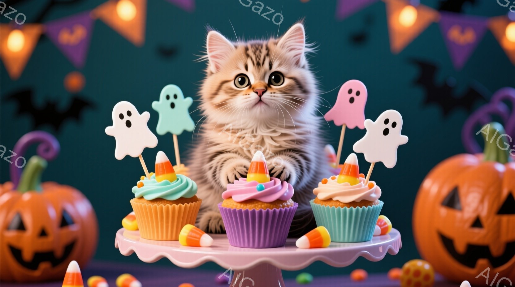 縞模様の小さな子猫が、ハロウィーンをテーマにしたケーキスタンドの上に座っています。ケーキスタンドには、お化けの飾りとキャンディコーンが飾られたカップケーキが置かれ、周囲にはパンプキンとハロウィーンの飾り付けが散りばめられています。全体的に、可愛らしく、お祝いムード満点のハロウィーンの雰囲気です。