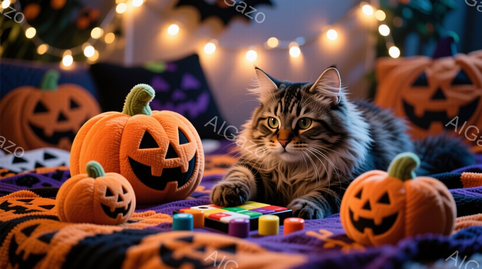 縞模様の小さな子猫が、ハロウィーンをテーマにしたケーキスタンドの上に座っています。ケーキはピンクと水色のクリームで飾られ、キャンディコーンや幽霊の形をしたトッピングが添えられています。背景には、カラフルなキャンディコーンやジャック・オ・ランタンが配置され、全体的に明るく楽しいハロウィーンの雰囲気を醸し出しています。