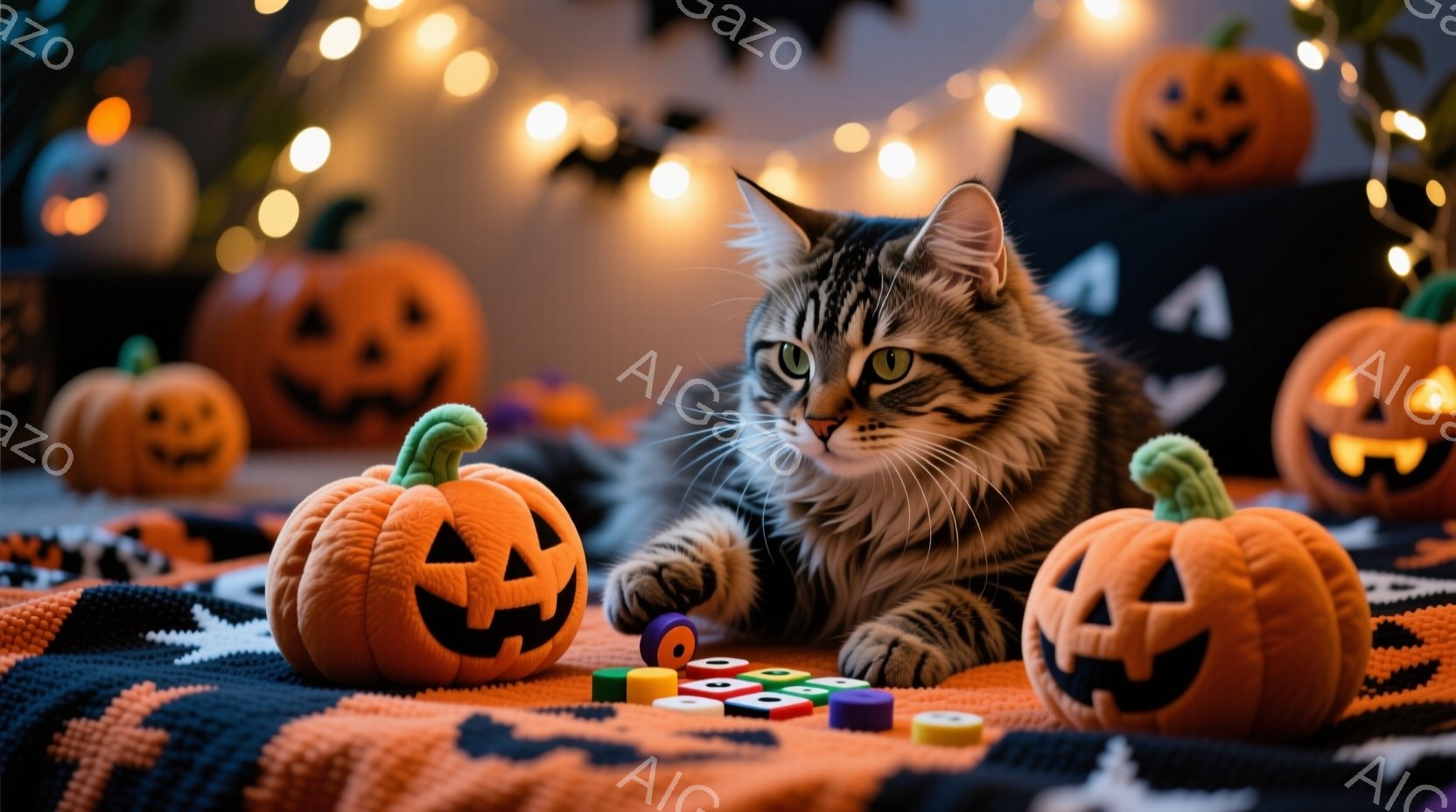 白と黒の模様の猫が、ハロウィーンをテーマにした毛布の上に横たわっています。オレンジ色のジャック・オ・ランタンの縫いぐるみが猫の左右に置かれ、カラフルな円盤が猫の足元に散らばっています。背景には、さまざまなハロウィーンの装飾がぼんやりと見え、全体的に温かく、お祝いムードが漂っています。