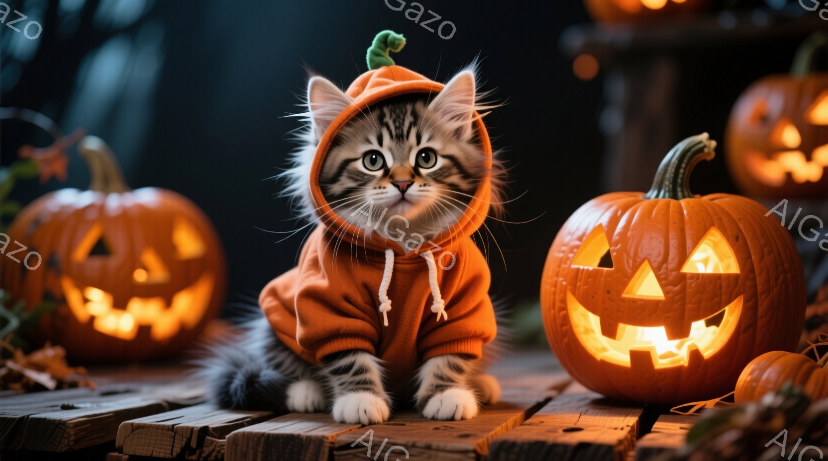 白とグレーの毛並みを持つ子猫が、オレンジ色のカボチャの衣装を着て、木製の台の上に座っています。その表情は好奇心に満ちており、正面を見つめています。背景には、様々な大きさのジャック・オ・ランタンが配置され、ハロウィーンの夜らしい温かく幻想的な雰囲気を醸し出しています。