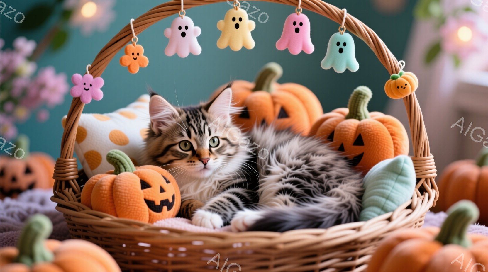 縞模様の小さな子猫が、ハロウィーンの飾りで満たされたバスケットの中に丸まって眠っています。バスケットの中にはオレンジ、水色、ピンク色のカボチャのぬいぐるみがあり、バスケットの周りにも様々な大きさのカボチャが散りばめられています。全体的に柔らかく、可愛らしい雰囲気で、ハロウィーンの温かい情景が表現されています。