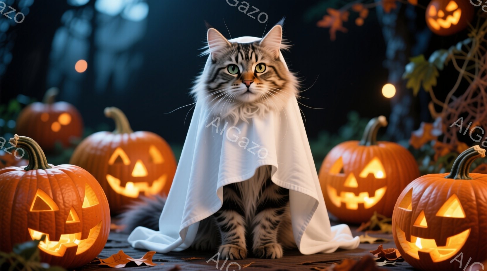 この無料AI生成画像「三匹の猫がハロウィーンの衣装を着て並んで座っています。左の猫はジャック・オー・ランタンの衣装、中央の猫は魔女の帽子と衣装、右の猫はドラキュラの衣装を着ています。背景には、様々なジャック・オー・ランタンとハロウィーンの飾りがあり、お祝いムードを盛り上げています。」は、2025年10月25日に作成されました。 サイズは 1664×928px の高解像度で、商用利用も可能なフリー素材として提供しています。