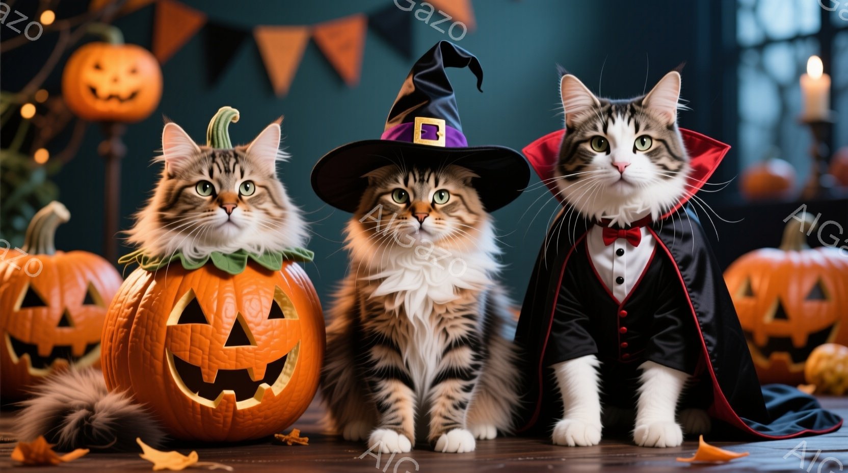 三匹の猫がハロウィーンの装飾の中でポーズをとっています。左の猫はカボチャの帽子をかぶり、中央の猫は魔女の帽子をかぶって少し驚いた表情をしています。右の猫は紫色のマントと赤い蝶ネクタイを着て、洗練された雰囲気です。