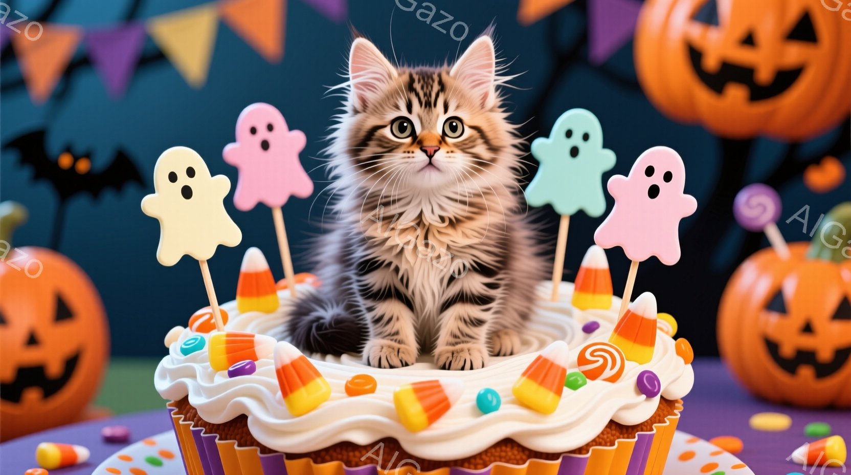 白と黒の縞模様の小さな子猫が、ハロウィーンをテーマにしたカップケーキの上に座っています。カップケーキは紫色の包装紙で飾られ、オレンジ色のキャンディーコーンや幽霊の形をしたトッピングが乗せられています。背景には、ハロウィーンの装飾品であるカボチャや幽霊が散りばめられており、お祝いの雰囲気を醸し出しています。