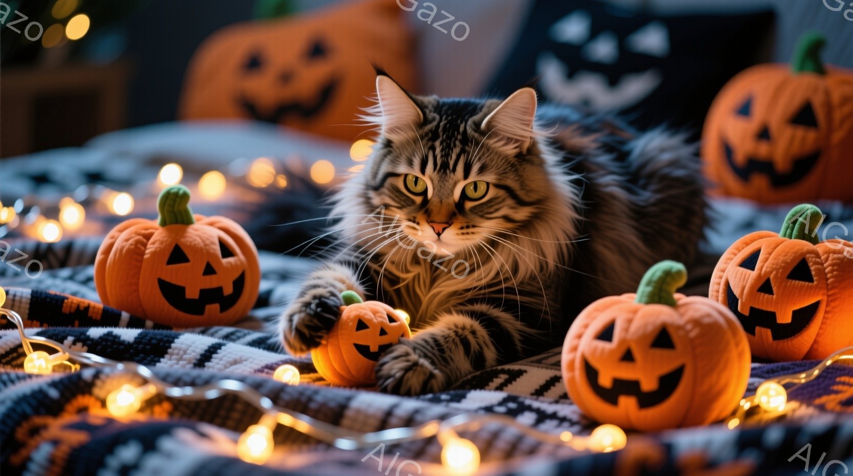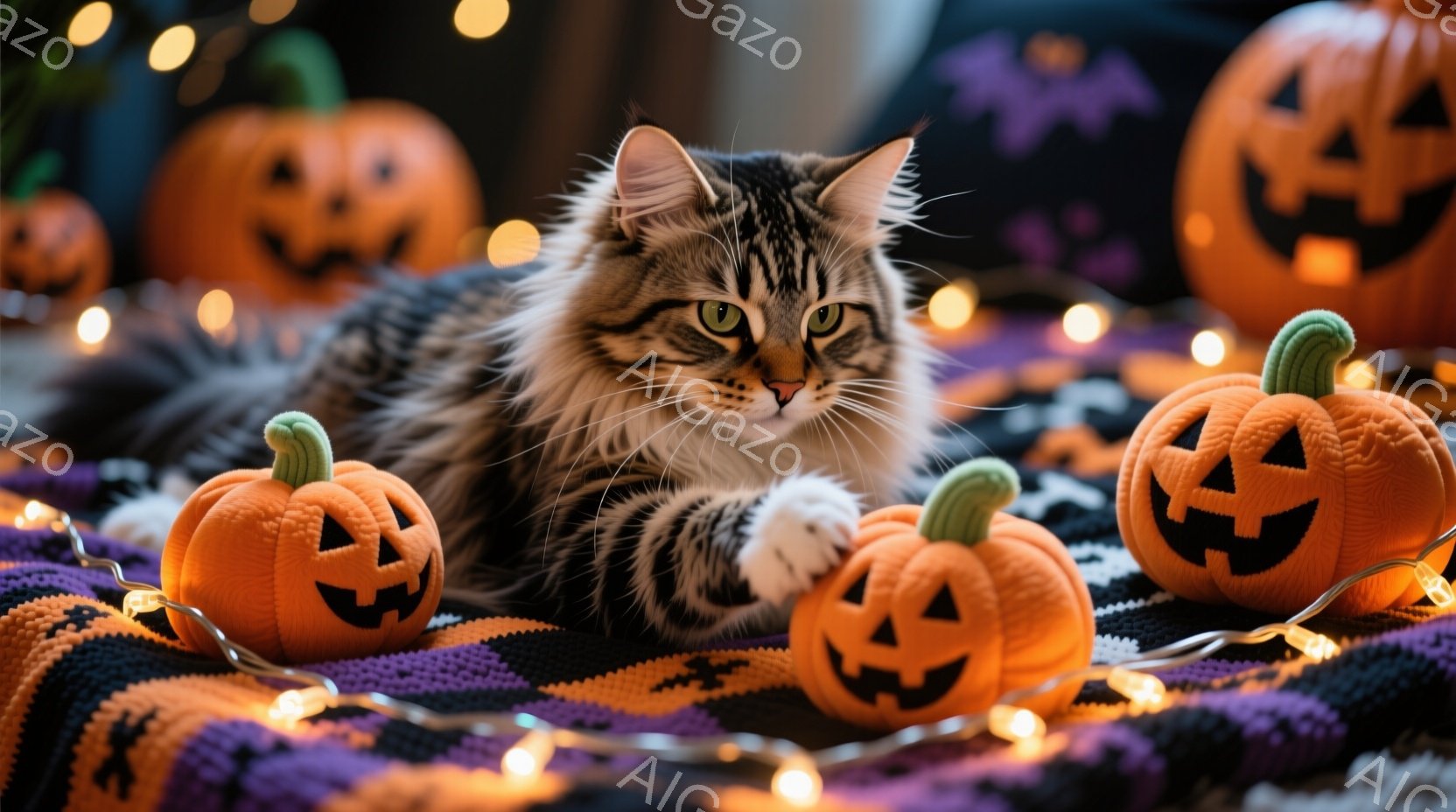 長毛の猫が、ハロウィーンの装飾である小さなカボチャに囲まれて横たわっています。猫は毛並みが美しく、緑色の瞳が印象的で、リラックスした表情をしています。背景には紫色の布とオレンジ色のカボチャが並び、暖かい光のイルミネーションがハロウィーンらしい雰囲気を醸し出しています。