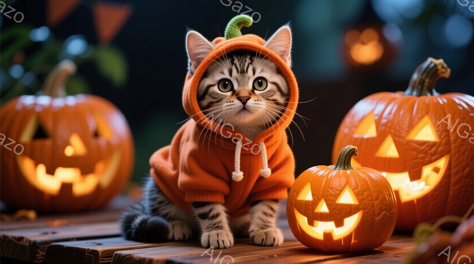 白と灰色の縞模様の猫が、オレンジ色のカボチャの衣装を着て、木製のテーブルの上に座っています。カボチャの衣装にはフードと結び目があり、猫はカメラの方を見て、落ち着いた表情をしています。背景には、様々な大きさのジャック・オー・ランタンが置かれ、ハロウィーンの雰囲気を醸し出しています。