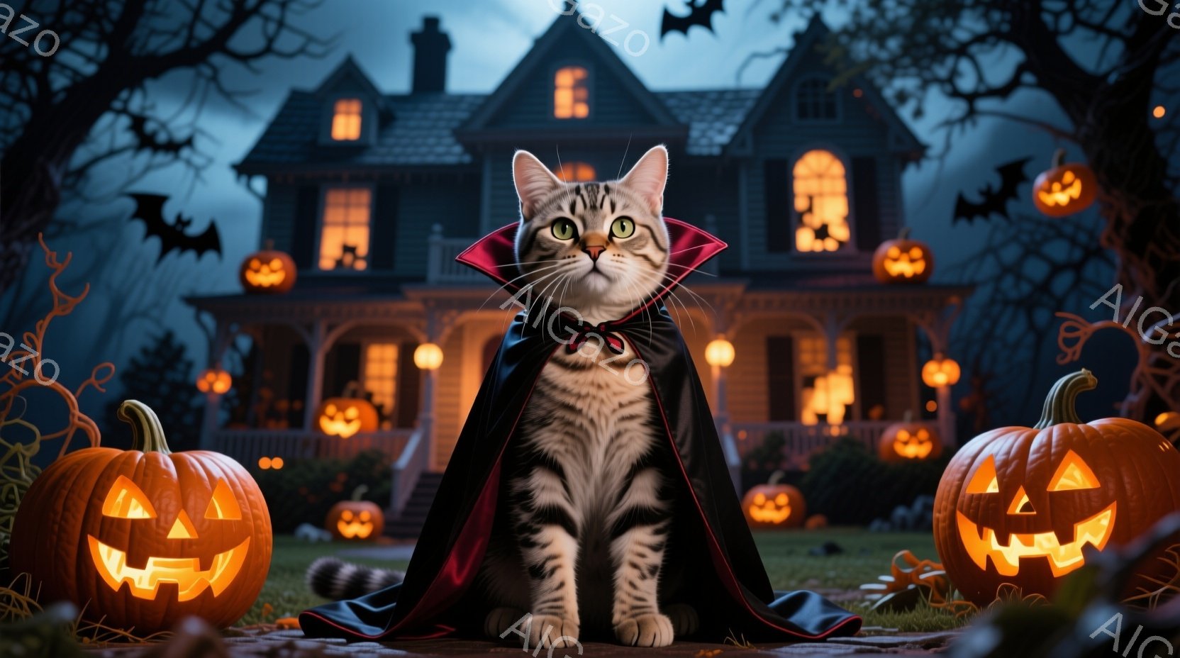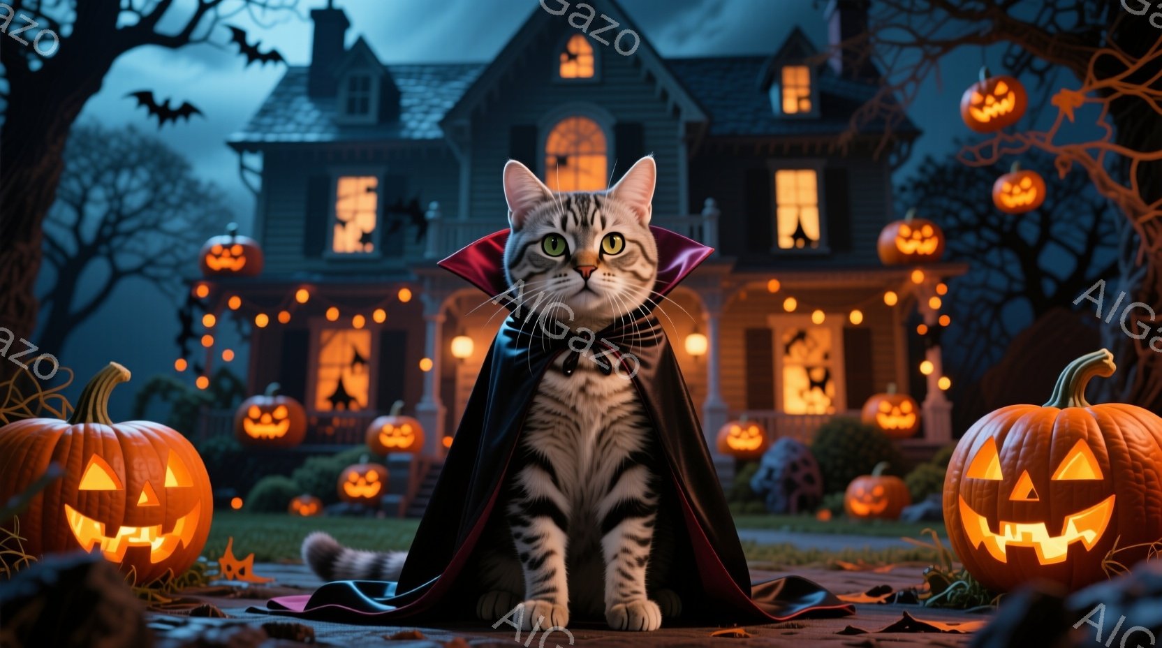 縞模様の猫が、ハロウィーンの夜に吸血鬼のケープと襟を付けて座っています。背景には、ジャック・オー・ランタンで飾られた不気味な家と、空を飛ぶコウモリが見え、ハロウィーンの夜の雰囲気を盛り上げています。地面には落ち葉が散らばり、全体的に幻想的で少し不気味な雰囲気が漂っています。