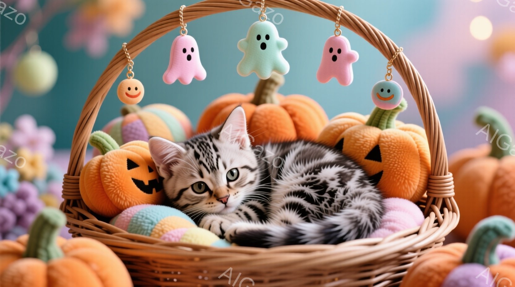 籠の中に縞模様の猫が横たわっており、周囲にはハロウィーンの装飾であるカボチャのぬいぐるみや幽霊の飾り付けが散りばめられています。猫はリラックスした表情で、丸まって眠っているかのように見えます。背景は淡いピンク色の布とぼやけた光で、全体的に暖かく、可愛らしいハロウィーンの雰囲気を醸し出しています。