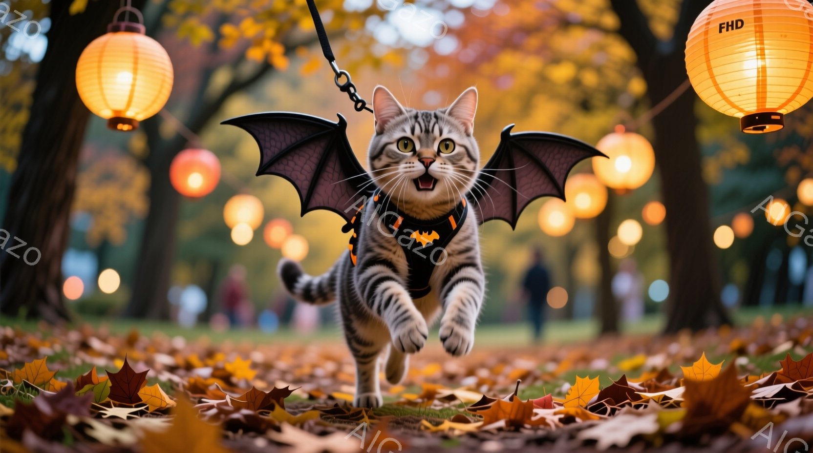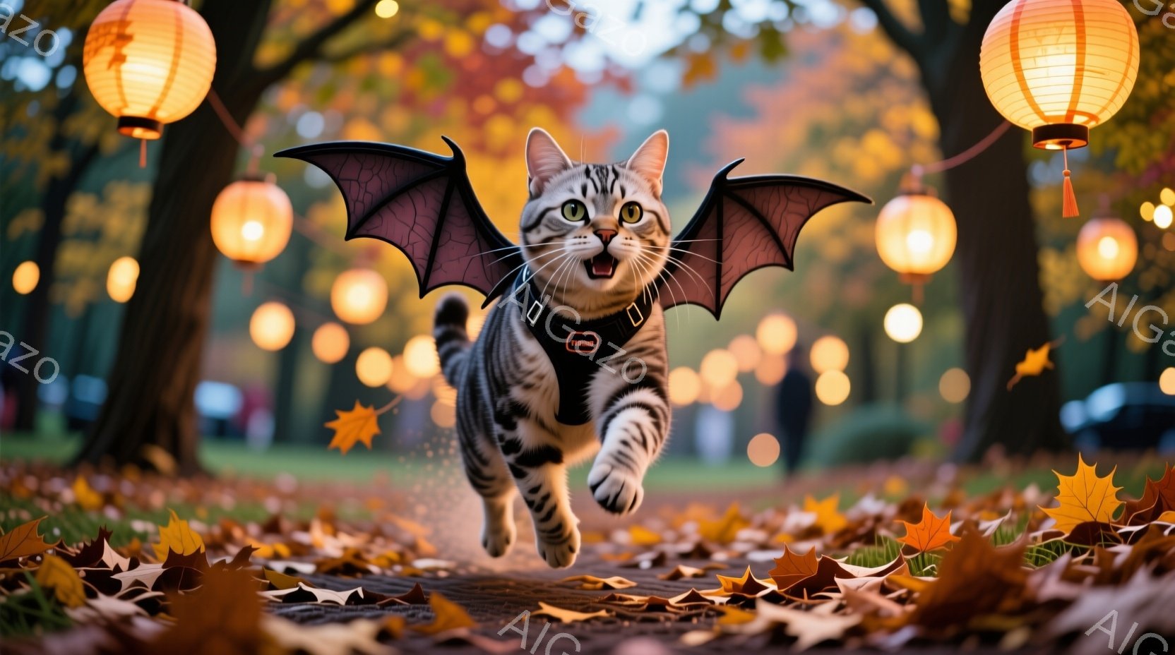 茶色と黒の縞模様の猫が、まるで飛んでいるかのように地面を走り、背中には黒いコウモリの翼が取り付けられています。背景には、オレンジ色の提灯が並び、地面は紅葉で覆われ、秋の公園の温かく幻想的な雰囲気を醸し出しています。猫は興奮した表情で、楽しげに走り回っている様子が伺えます。