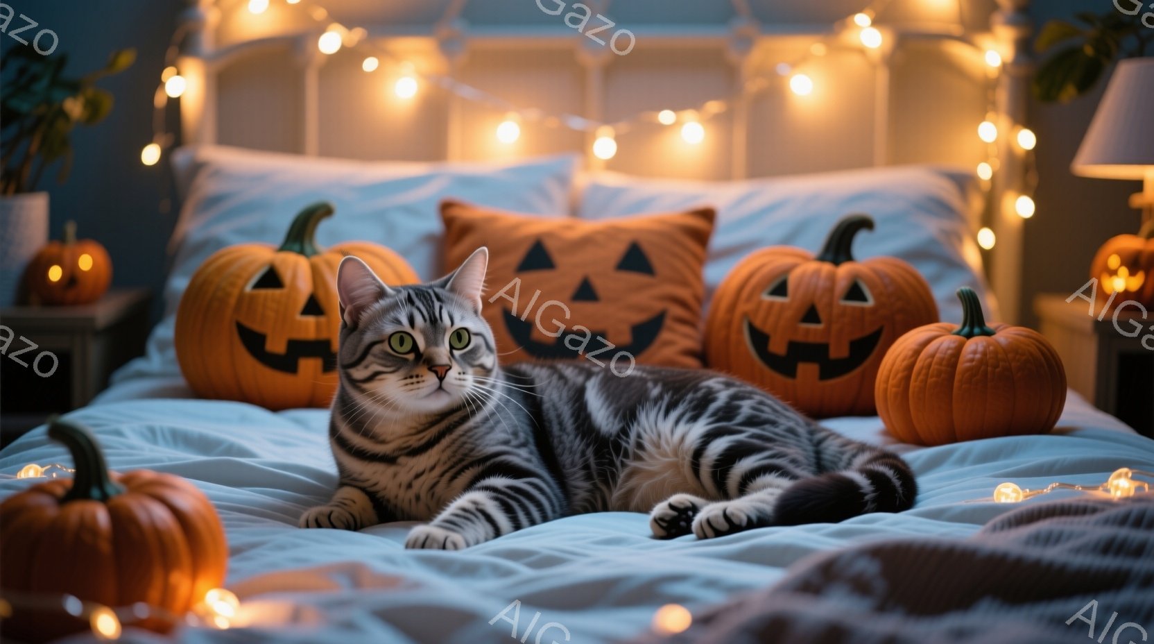 この無料AI生成画像「茶色の縞模様の猫が、星が散りばめられた青い魔法使いの帽子とマントを身に着けて座っています。猫は正面をまっすぐ見つめ、落ち着いた表情をしています。背景には、不気味な光を放つジャック・オー・ランタンと、暗い森が広がっており、ハロウィーンの神秘的な雰囲気を醸し出しています。」は、2025年10月25日に作成されました。 サイズは 1664×928px の高解像度で、商用利用も可能なフリー素材として提供しています。