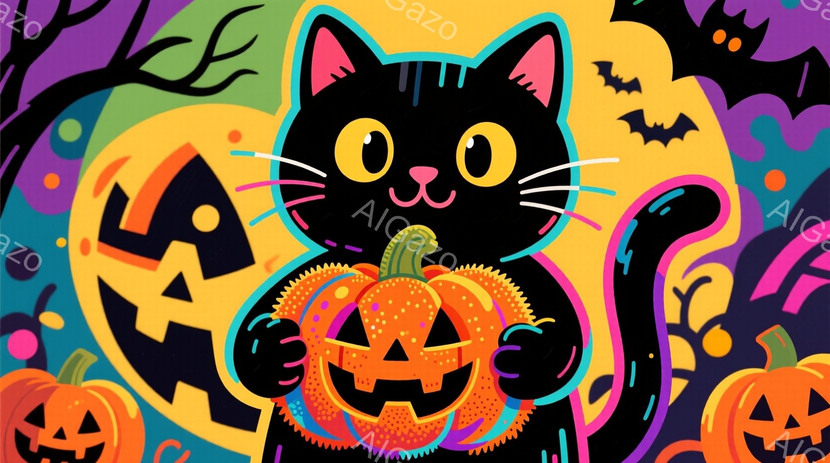 ハロウィーンをテーマにした可愛らしいイラストで、紫色のカップケーキの上に子猫が座っています。背景には、かぼちゃのランタン、お化けの飾り、キャンディコーンなどが配置され、お祭り気分を盛り上げています。全体的に明るく、温かみのある雰囲気で、ハロウィーンの楽しさが伝わってきます。