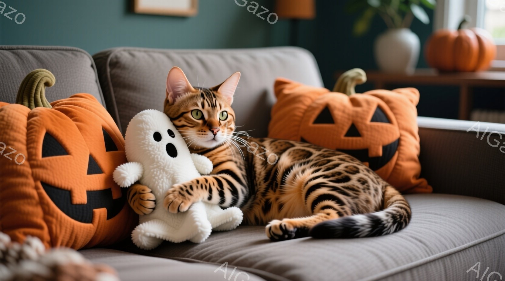 ソファの上で、縞模様の猫が横たわり、白い幽霊のぬいぐるみと寄り添っています。背景にはハロウィーンの装飾が施されたカボチャのクッションや置物が散りばめられ、秋の温かく穏やかな雰囲気を醸し出しています。猫はリラックスした表情で、室内は暖色系の照明で照らされ、居心地の良い空間となっています。