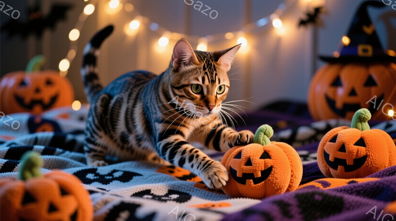 縞模様の猫が、ハロウィーンの小さなカボチャの置物の中にいる様子が写っています。猫は前足を伸ばしてカボチャに触れようとしており、好奇心旺盛な表情をしています。背景には、ハロウィーンをテーマにした柄の布と、ぼんやりと光る電飾があり、温かくお祝いムードに包まれています。