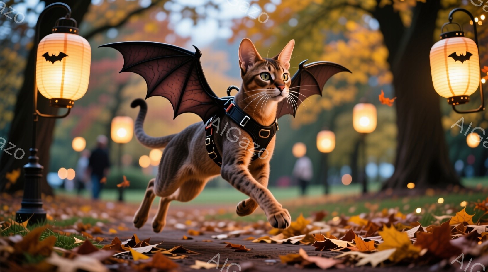 茶色の縞模様の猫が、まるで空を飛んでいるかのように、公園の小道の上を走り去る姿が捉えられています。猫は黒い翼とハーネスを身に着け、活気に満ちた表情で楽しそうに駆け抜けています。背景には、紅葉した木々と、ぼんやりと光る街灯が並び、秋の暖かい雰囲気が漂っています。