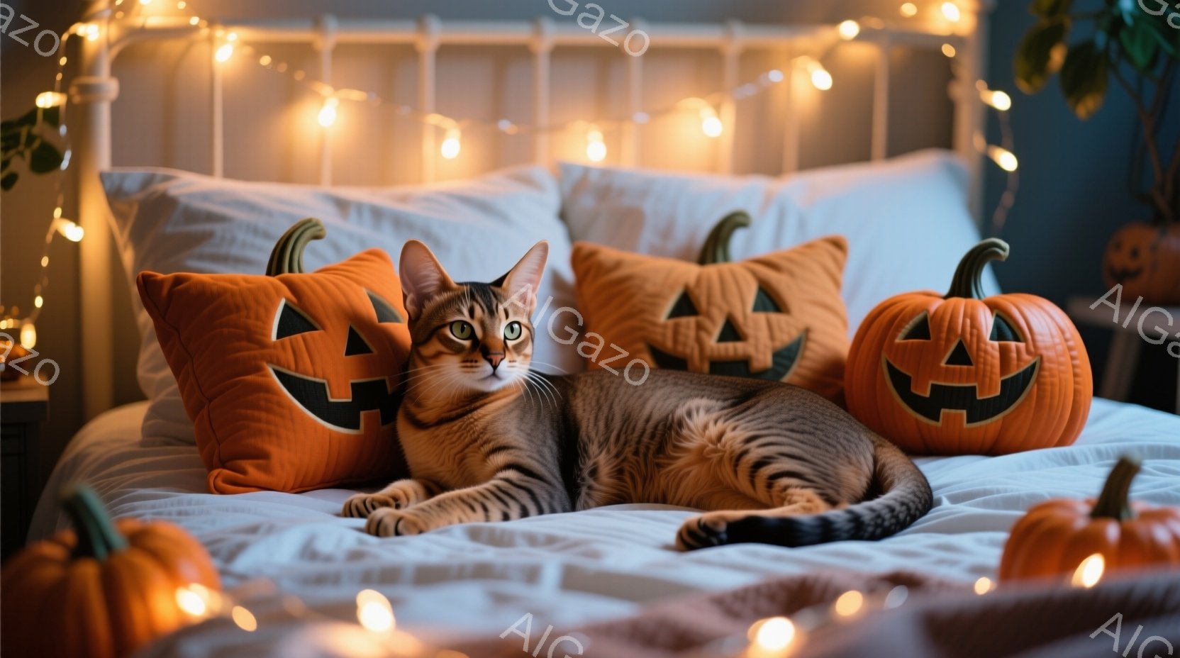ベッドの上には、ハロウィーンの装飾であるジャック・オ・ランタンのクッションが並び、その中央で茶色の縞模様の猫がリラックスして横たわっています。猫は前足を組み、カメラ目線で穏やかな表情を浮かべており、周りには小さな光の飾り付けが暖かく照らしています。全体的に、秋らしい雰囲気と猫の安らぎが感じられる、温かい光景です。