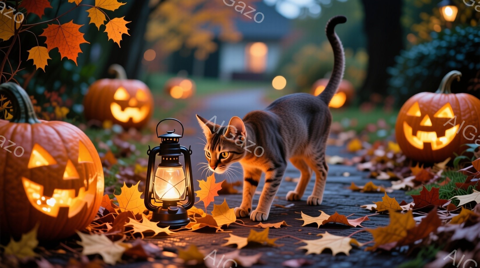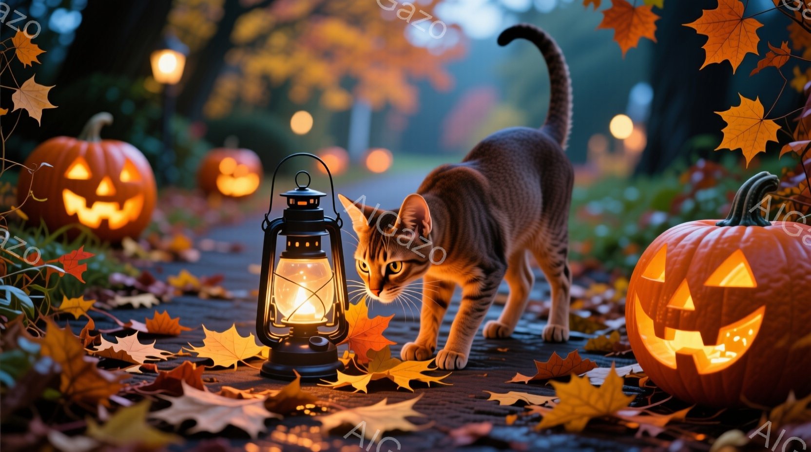 ハロウィーンの装飾が施された暗い道に、茶色の縞模様の猫が潜んでいる様子が写っている。周囲には、彫刻が施されたカボチャと落ち葉が散らばり、背景にはぼんやりと木々が見える。点灯したランタンが猫とカボチャを照らし、ハロウィーンらしい幻想的で温かい雰囲気を醸し出している。
