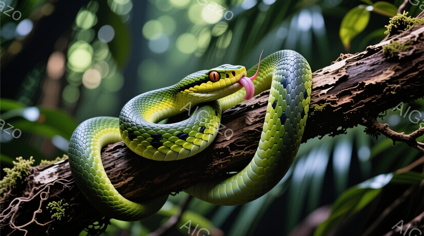 鮮やかな緑色のヘビが、苔むした木の枝に体を巻き付けている。舌を伸ばして周囲を探索している様子がうかがえ、その目は鋭い光を放っている。背景には緑豊かな植物がぼやけており、熱帯雨林のような湿った雰囲気が感じられる。