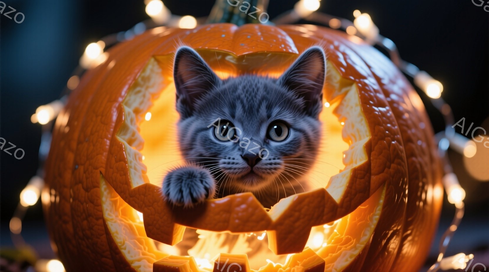 ハロウィーンの装飾であるくり抜かれたカボチャの中に、灰色の猫が顔を出しています。猫は正面を見つめ、少し驚いたような表情をしています。背景にはぼやけた光のストリングがあり、全体的に暖かく、遊び心のある雰囲気を醸し出しています。