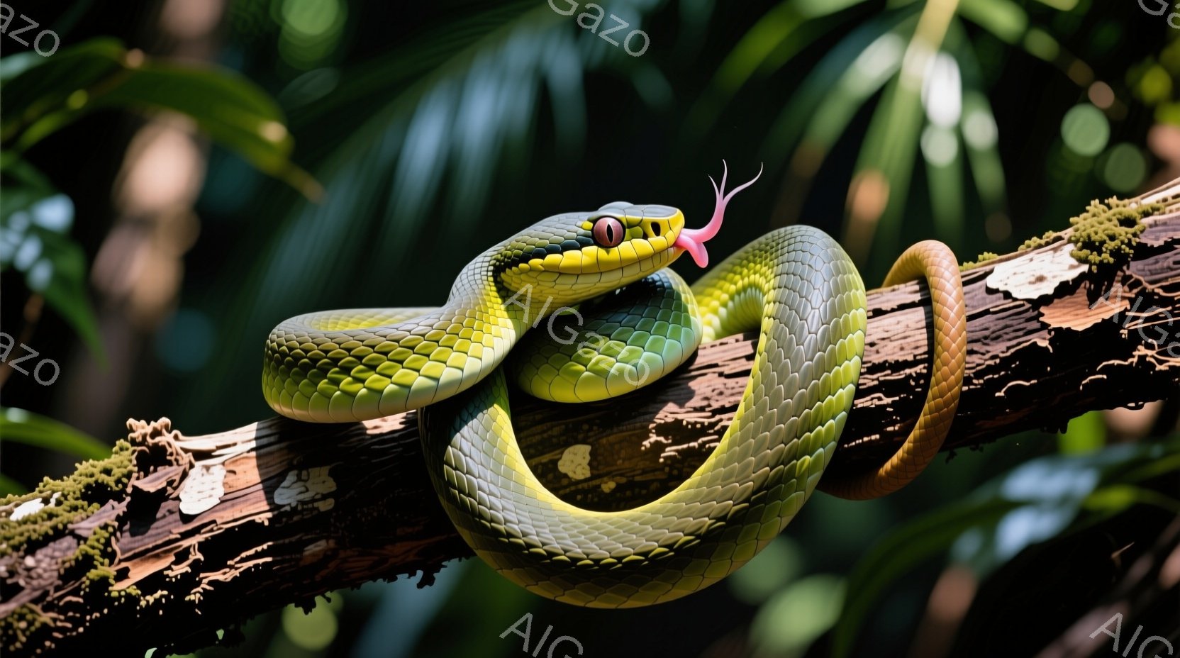 鮮やかな緑色のヘビが木の枝に巻き付いています。舌をペロリと出し、鋭い視線でこちらを見ている様子は、どこか神秘的で活気に満ちています。背景には緑豊かな葉がぼやけており、熱帯雨林のような自然環境を感じさせます。