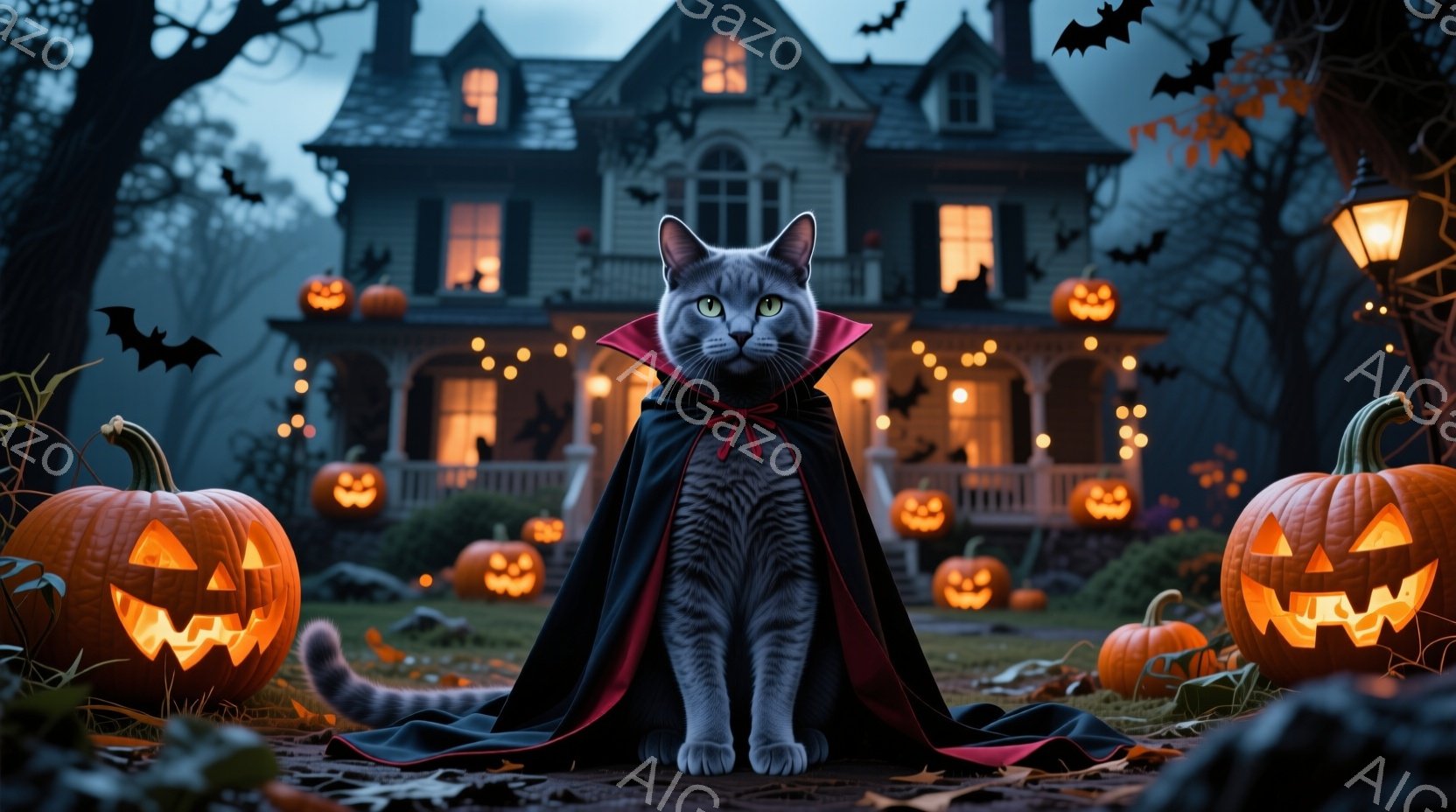 灰色の猫が吸血鬼風の黒いマントを羽織って、庭の石畳の上に座っています。背景には、ハロウィーンの飾り付けがされた古い家、空にはコウモリが舞い、庭にはジャック・オ・ランタンが並べられ、夜の雰囲気と合わせて不気味で楽しいハロウィーンの夜を演出しています。暖色系の光が、秋の葉が散らばる庭を照らし、ハロウィーンの魔法のような雰囲気をさらに高めています。