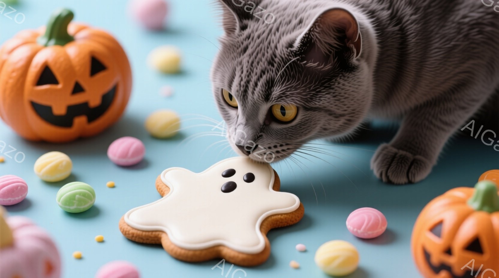灰色の猫がハロウィーンをテーマにしたクッキーとマカロンの前に忍び寄っている様子が描かれています。背景にはジャック・オ・ランタンがあり、柔らかい光が当たって暖かく、遊び心のある雰囲気を醸し出しています。猫は興味津々でクッキーを見つめ、その視線はいたずらっぽく、楽しいハロウィーンの雰囲気を演出しています。