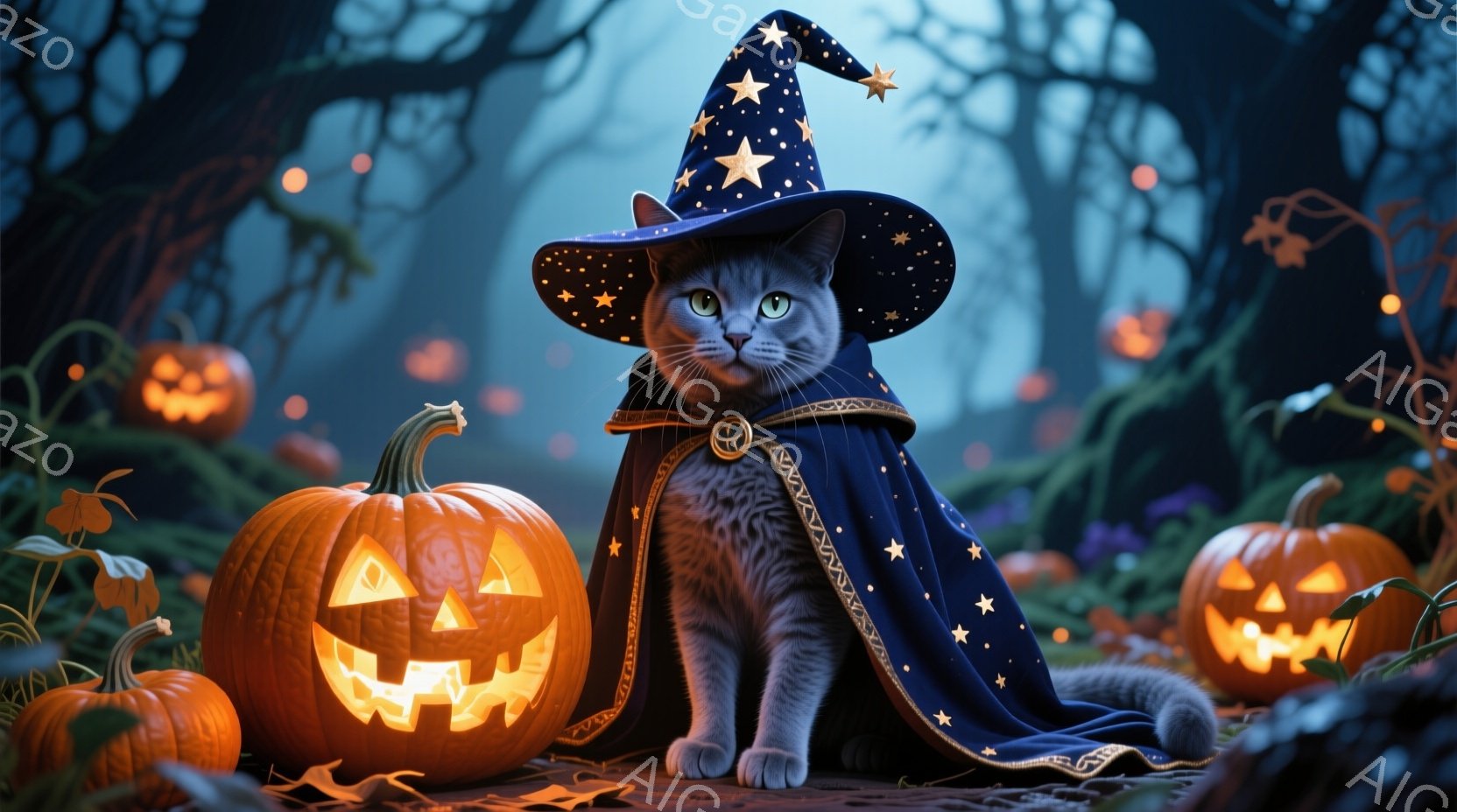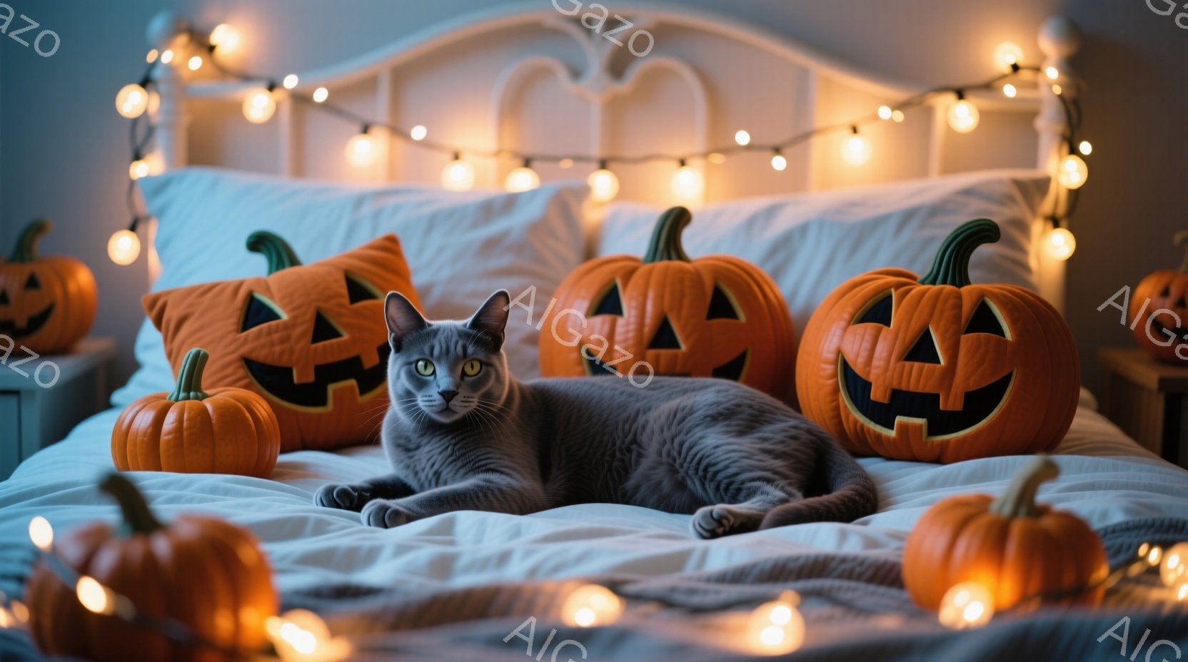 灰色の毛並みの猫が、ハロウィーンの飾りであるジャック・オ・ランタンに囲まれたベッドの上で横たわっています。猫はリラックスした様子で、穏やかな表情でカメラを見ています。背景には、ぼんやりと見えるナイトテーブルと、暖色系の光が灯る電飾があり、ハロウィーンの温かく、心地よい雰囲気を作り出しています。