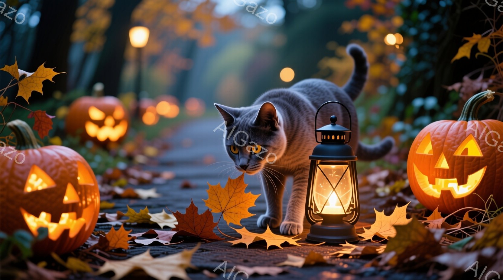 煉瓦造りの小道に、切り株で作られたジャック・オ・ランタンが並び、その間を灰色の猫が慎重に進んでいます。猫は丸みを帯びた耳と大きな目を持ち、どこかを見つめるような表情をしています。背景にはぼやけた木々と、ハロウィーンらしいオレンジと黄色の落ち葉が散らばり、温かく幻想的な雰囲気を醸し出しています。
