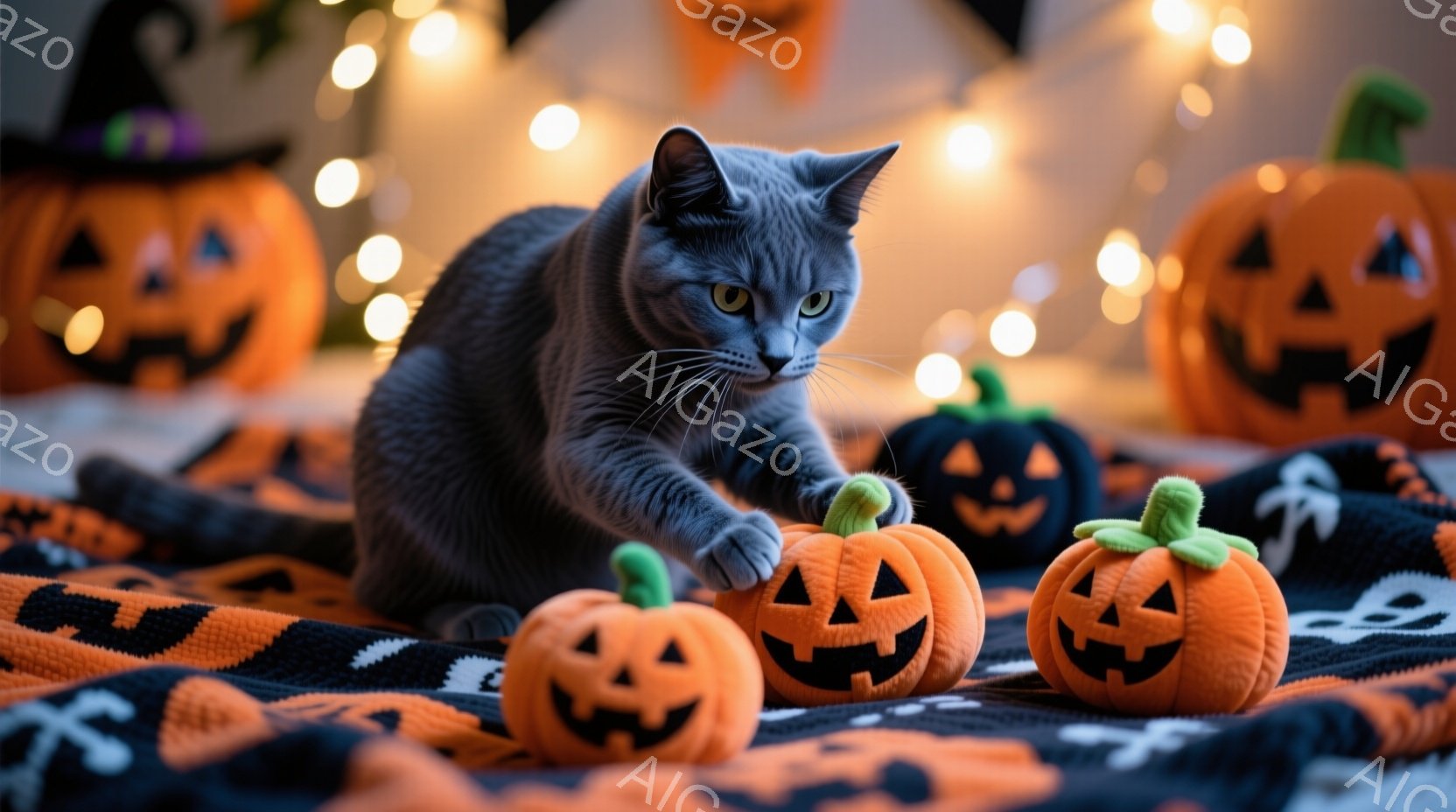 灰色の猫がオレンジ色のハロウィーンの装飾された毛布の上に座り、前足で小さなカボチャのおもちゃを軽く叩いています。背景には、さまざまな大きさのハロウィーンのカボチャのおもちゃと、ぼやけた暖かい色のライトが点在しており、季節感のある雰囲気を醸し出しています。 全体的に、猫はリラックスした様子で、遊び心のあるハロウィーンの雰囲気を楽しんでいるように見えます。