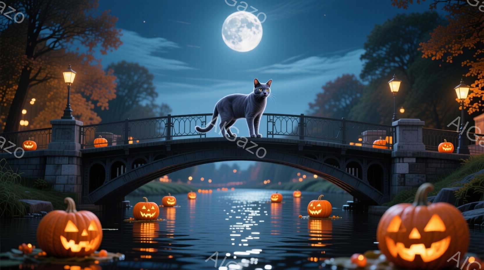 古い石橋の上には、灰色がかった毛並みの猫が堂々と立っている。橋の下の川面には、ジャック・オー・ランタンが浮かび、不気味でありながら幻想的な雰囲気を醸し出している。満月が夜空に輝き、木々の間からぼんやりと見える建物が、ハロウィーンの夜の神秘的な光景を作り出している。