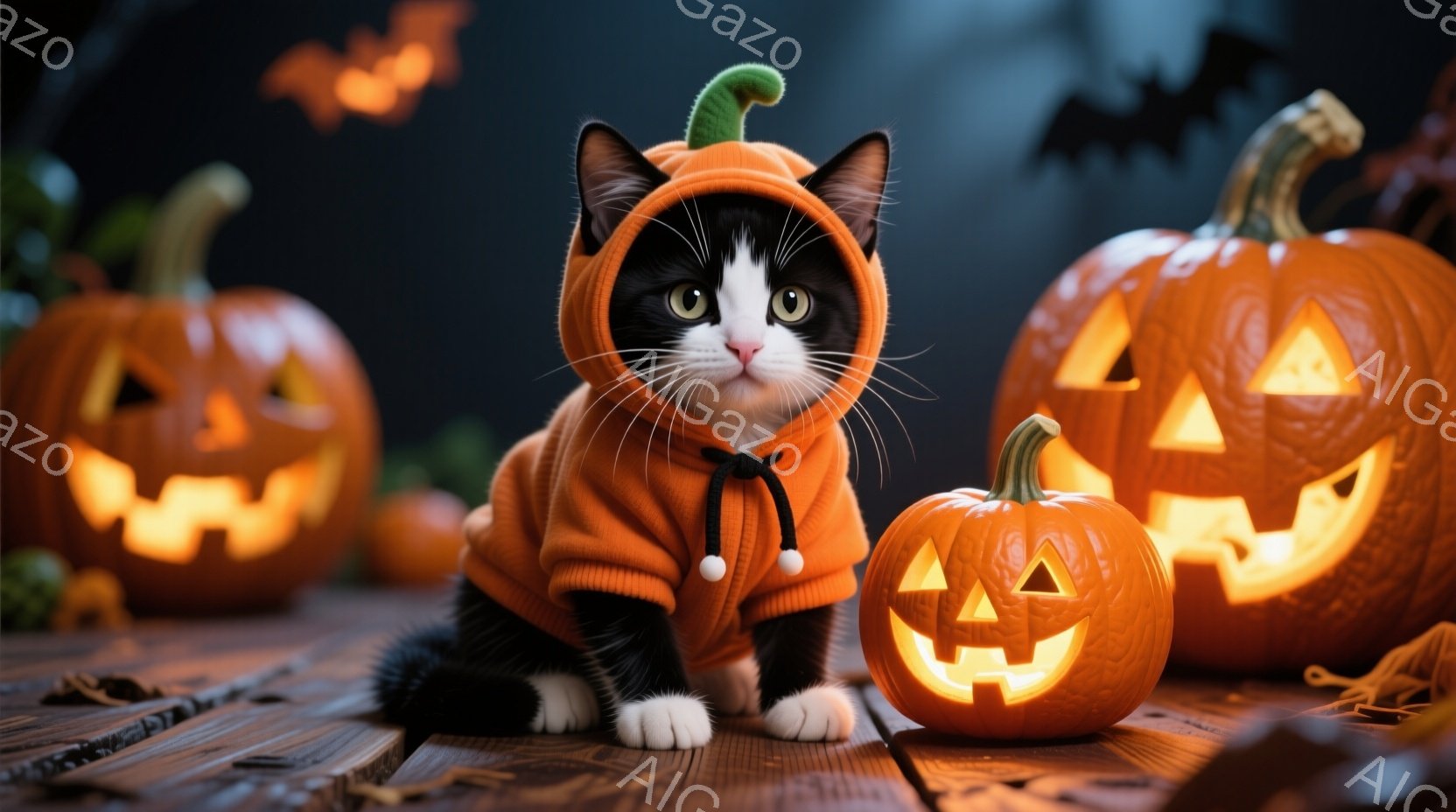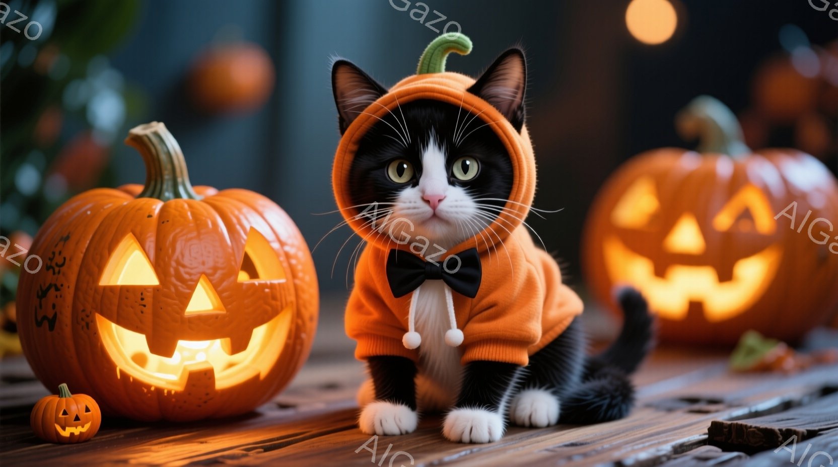 黒と白の猫が、ハロウィーンの衣装であるオレンジ色のカボチャの服を着て、カメラの方を見ています。その猫は、小さな黒い蝶ネクタイをつけ、可愛らしい表情をしています。背景には、ジャック・オー・ランタンがいくつか並び、ハロウィーンらしい雰囲気を作り出しています。