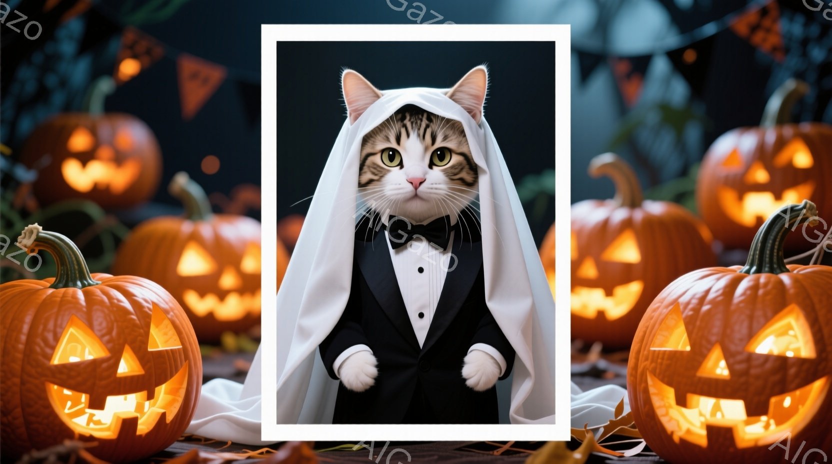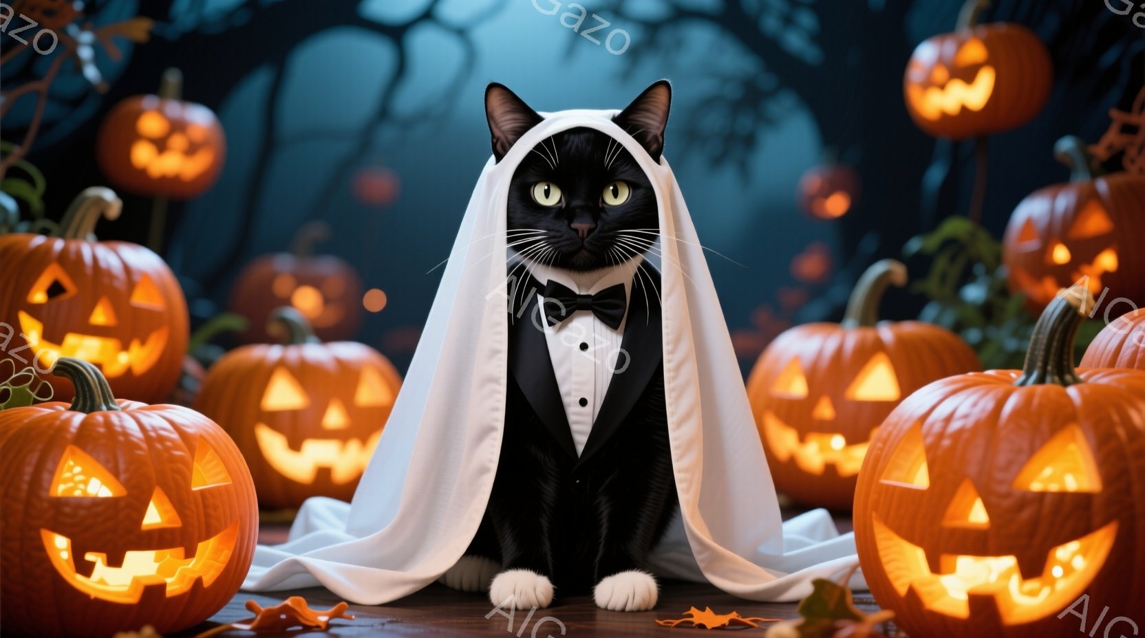 白と黒の猫が、ハロウィンの衣装であるタキシードと白いマントを身につけて立っている。猫は自信に満ちた表情で、正面を見据えている。背景には、オレンジ色の光を放つたくさんのジャック・オ・ランタンが並び、ハロウィーンの夜の雰囲気を醸し出している。