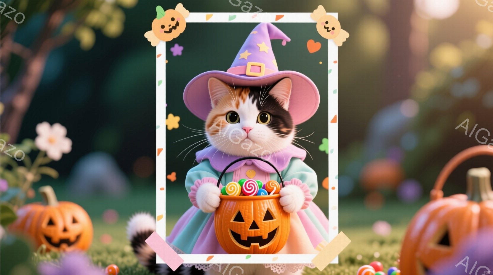 オレンジ色の縞模様の猫が、ピンクのドレスと魔女の帽子を身に着けています。猫はハロウィーンのバケツいっぱいのキャンディーを持っていて、嬉しそうな表情をしています。背景にはオレンジ色のカボチャや緑の草が写り、全体的に明るく、お祭り気分を醸し出しています。