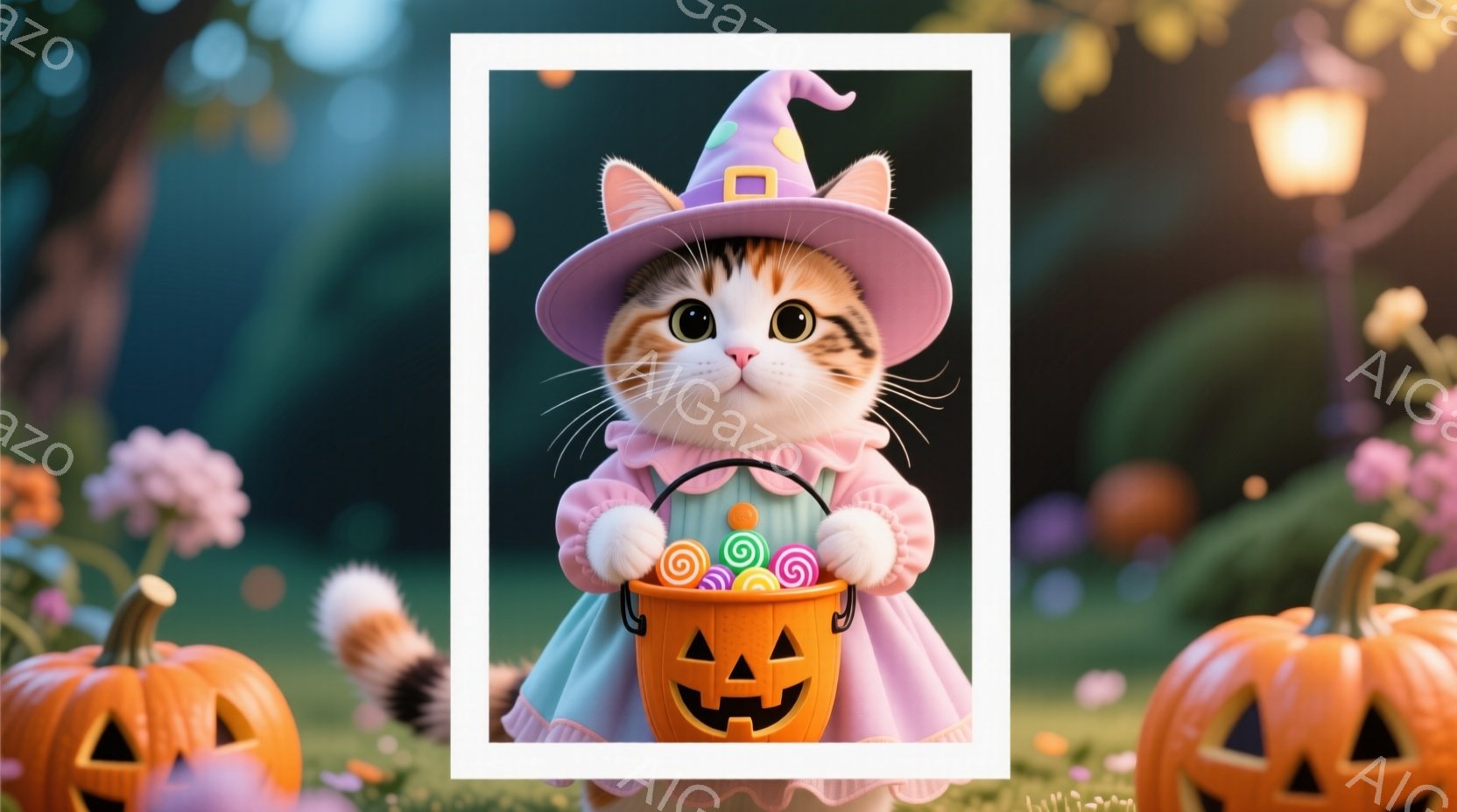 白とオレンジの毛並みを持つ猫が、ピンク色のドレスと先のとがった帽子を身に着けています。満面の笑みを浮かべ、中にはキャンディーが入ったジャック・オー・ランタンのバケツを抱えています。背景にはハロウィーンの飾り付けやカボチャが散りばめられており、全体的に楽しく、お祭り気分が漂う雰囲気です。