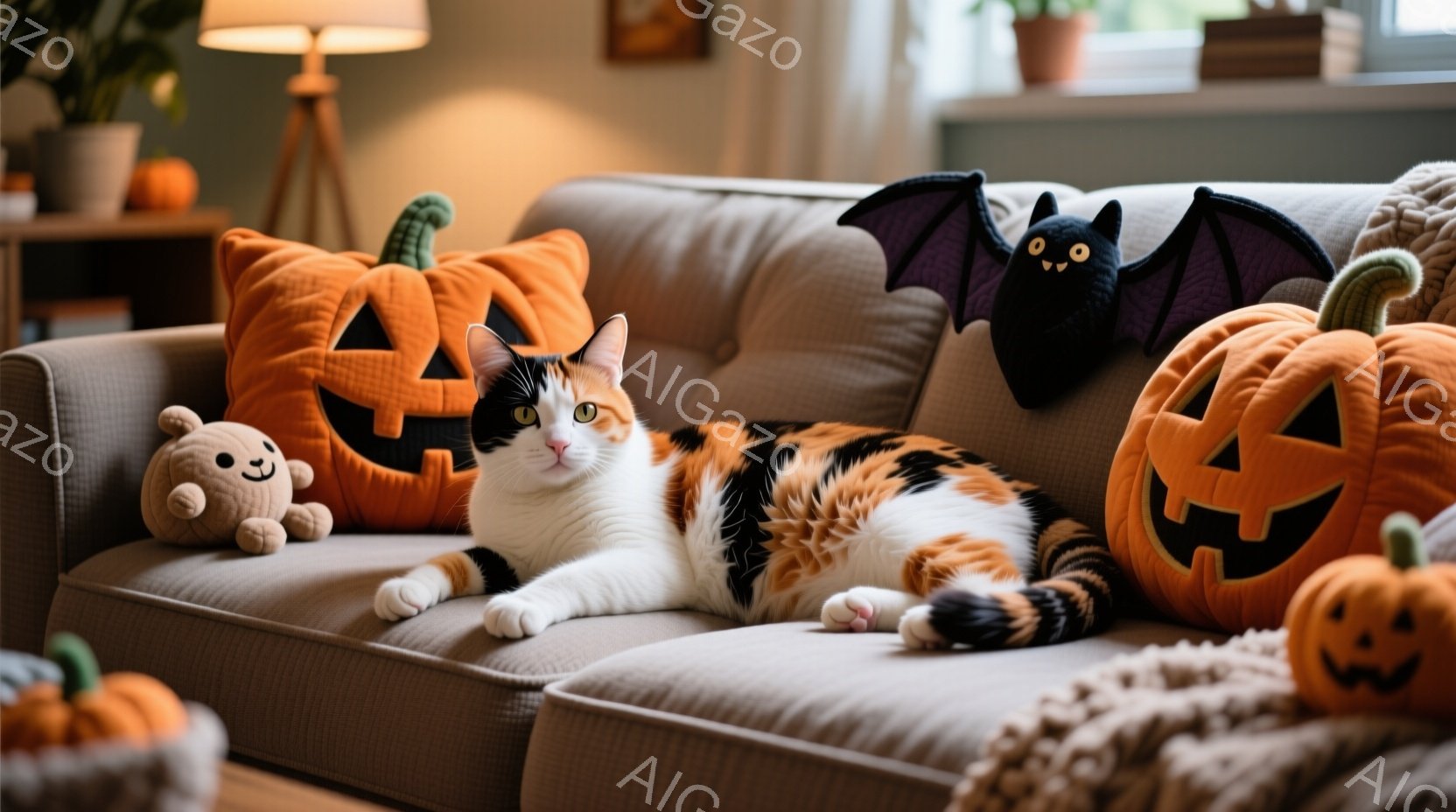 白とオレンジのまだら模様の猫が、ハロウィーンをテーマにしたクッションに囲まれたソファに横たわっています。猫はリラックスした様子で、カメラの方を見て穏やかな表情をしています。背景には、ハロウィーンの装飾が施された室内の様子がうかがえ、温かく居心地の良い雰囲気を醸し出しています。