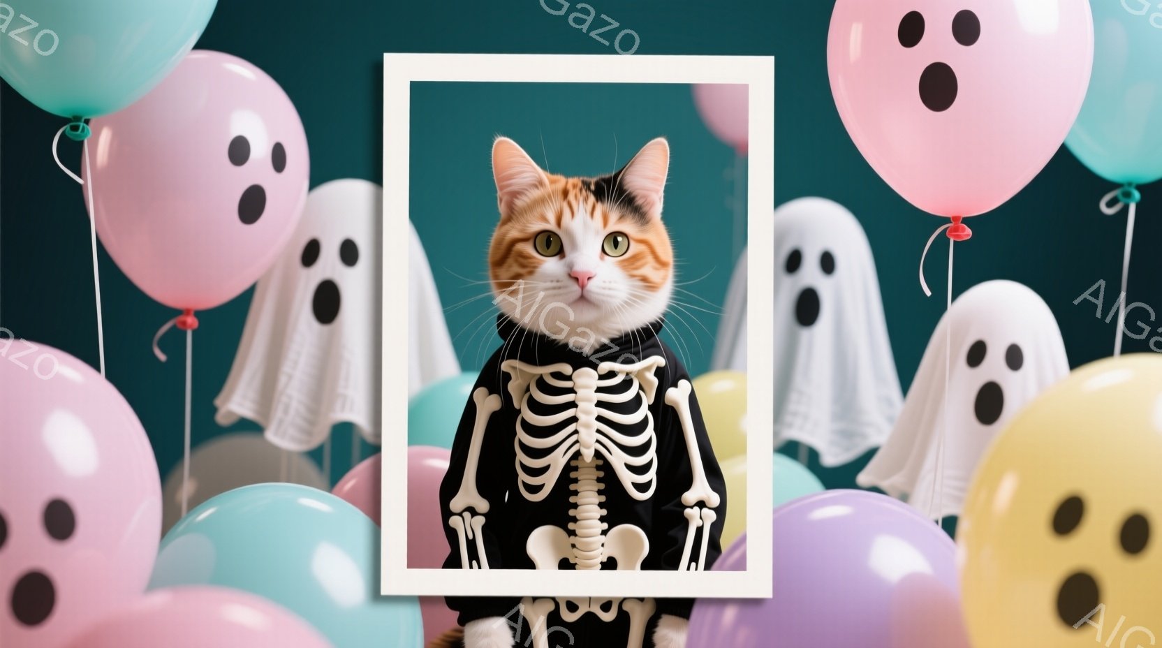 茶トラの猫が骸骨のコスチュームを着て正面を向いています。丸い顔に緑色の目をしており、少し驚いたような表情を浮かべています。背景にはパステルカラーの風船や幽霊の形をした装飾が浮かび、ハロウィーンらしい陽気な雰囲気を醸し出しています。