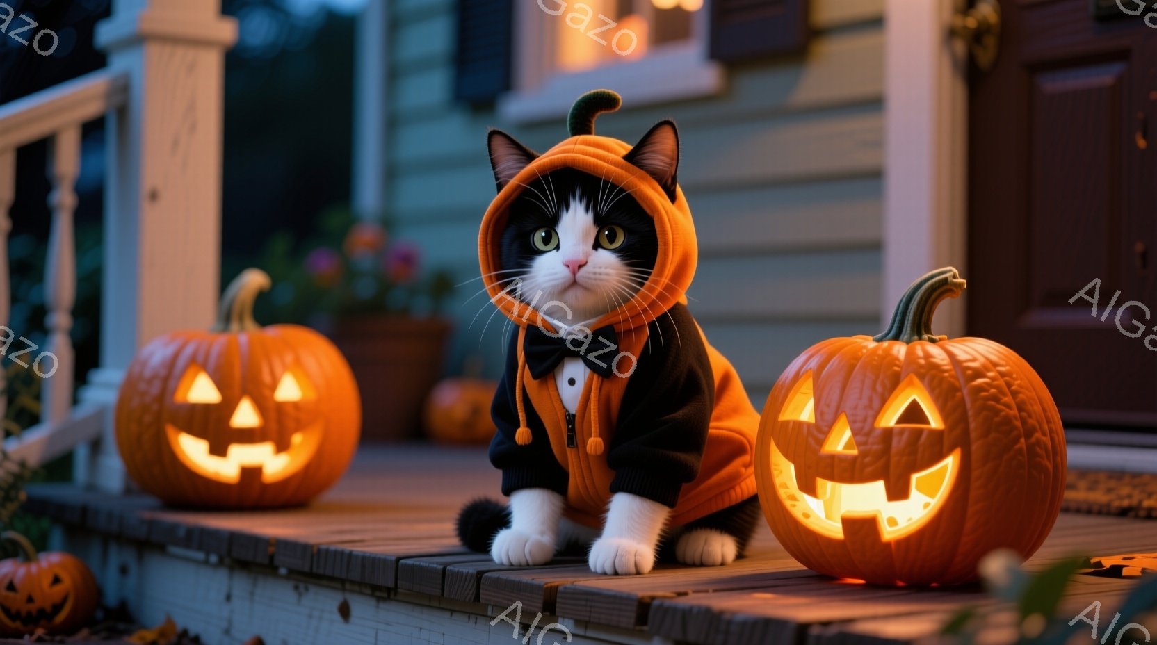 白と黒の猫が、ハロウィーンをテーマにしたオレンジ色のパーカーを着て、ポーチの階段に座っています。周りには様々な大きさのジャック・オ・ランタンが置かれ、背景にはぼんやりと家が見え、温かい光が灯っています。全体的に、可愛らしく、お祝いムード満載のハロウィーンの雰囲気です。