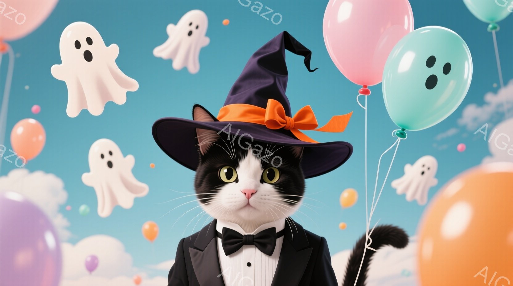 白と黒の猫が、黒いタキシードと蝶ネクタイを身につけ、オレンジのリボンが付いた魔女帽子をかぶっています。猫は正面を見据え、少しいたずらっぽい表情を浮かべています。背景は水色の壁で、様々な色と表情の幽霊と風船で飾られています。