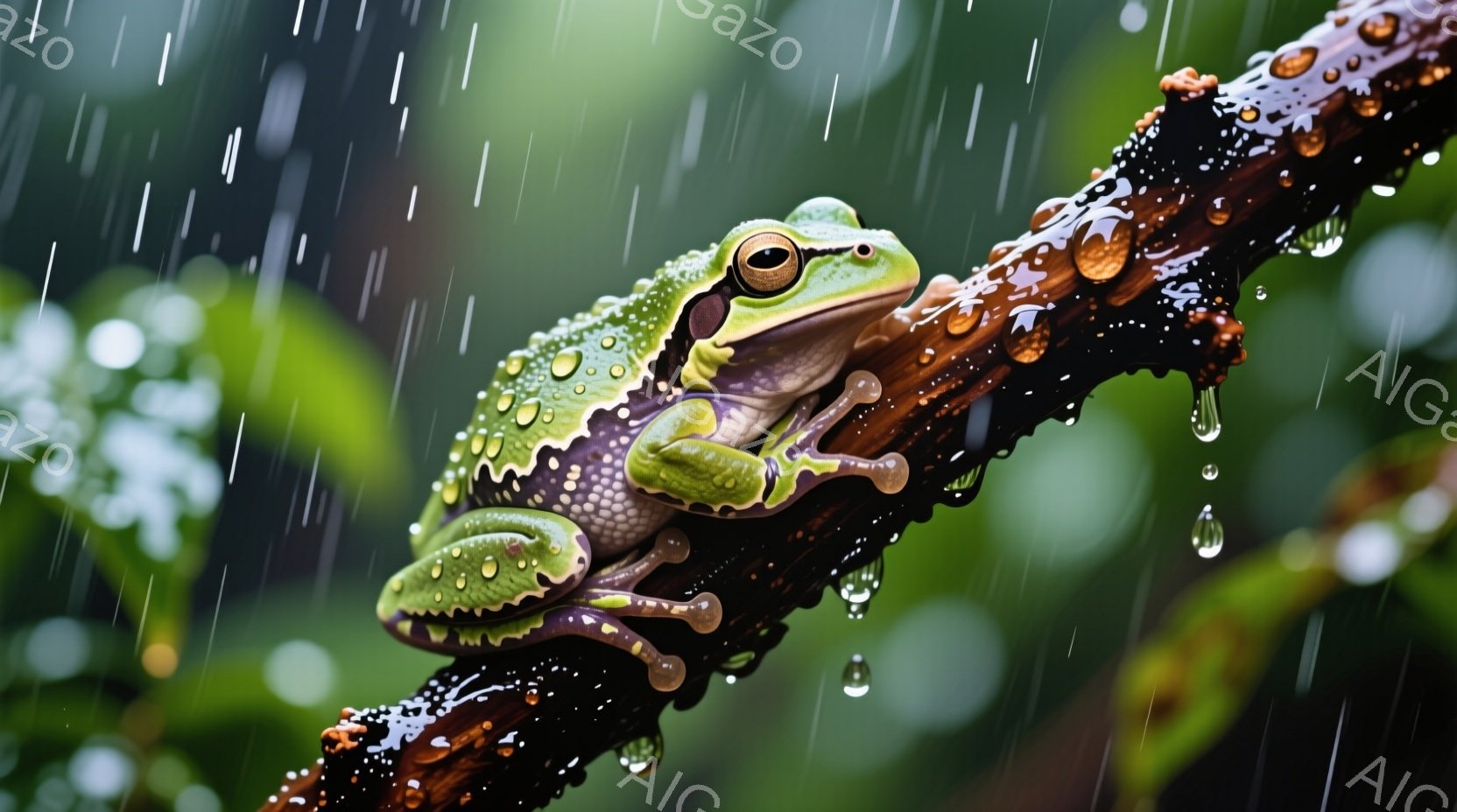 雨に濡れた緑色のカエルが木の枝にしっかりと掴まっています。そのカエルの体には雨粒が光り、木の枝も雨で濡れて輝いています。背景は緑豊かな自然で、雨が降り注ぎ、湿った雰囲気が漂う、生命力に満ちた瞬間が捉えられています。