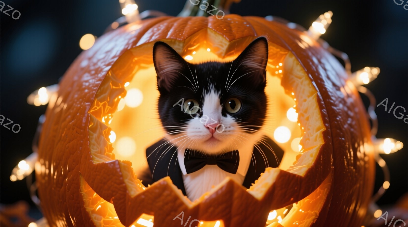 白と黒の毛並みを持つ子猫が、ハロウィーンのカボチャの中に座っています。黒い蝶ネクタイを着用し、少し驚いたような表情でカメラを見つめています。背景にはぼやけた光のイルミネーションが広がり、暖かく幻想的な雰囲気を醸し出しています。