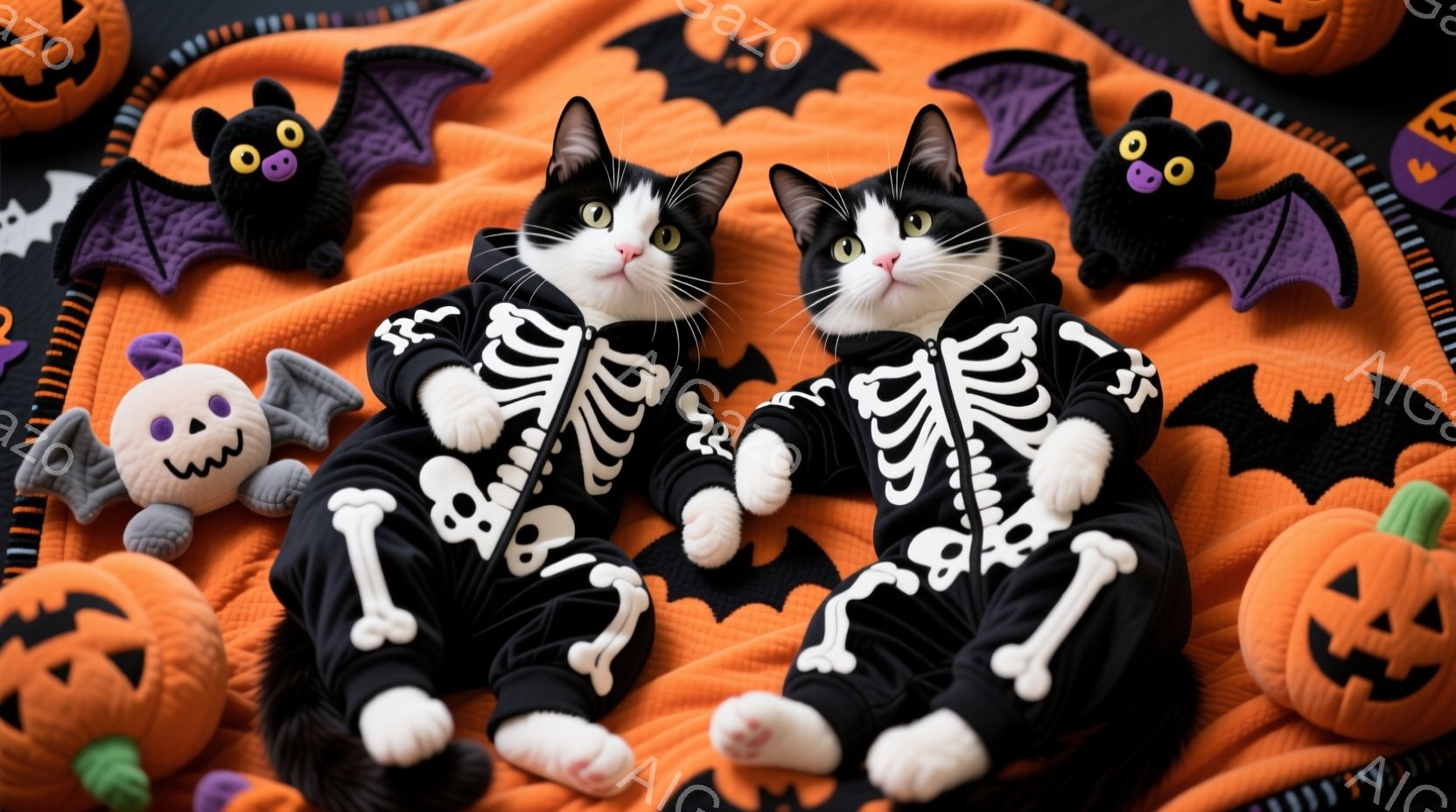 白と黒の猫がハロウィーンのスケルトン柄のジャンプスーツを着てオレンジ色の背景に横たわっています。猫たちはリラックスした表情で、左右に手足を広げています。背景には、カボチャの形のぬいぐるみやコウモリの飾りがあり、ハロウィーンの雰囲気を演出しています。