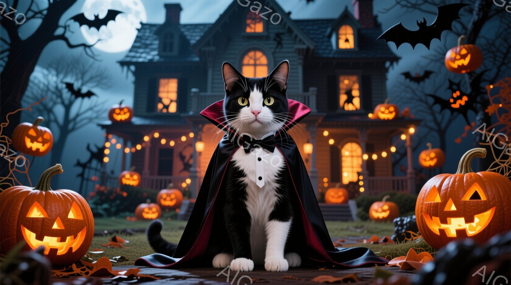 黒猫がハロウィーンの衣装を着て、庭に座っています。黒いマントと蝶ネクタイを身に着け、少し真剣な表情を浮かべています。背景には、オレンジ色のジャック・オ・ランタンで飾られた不気味な屋敷と、暗い夜空と月が見え、全体的にハロウィーンの雰囲気が漂っています。