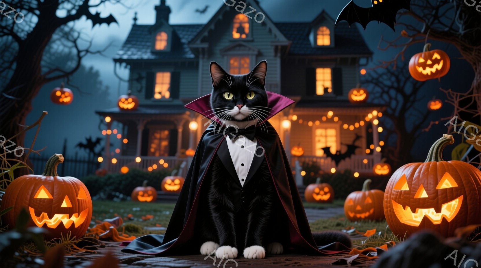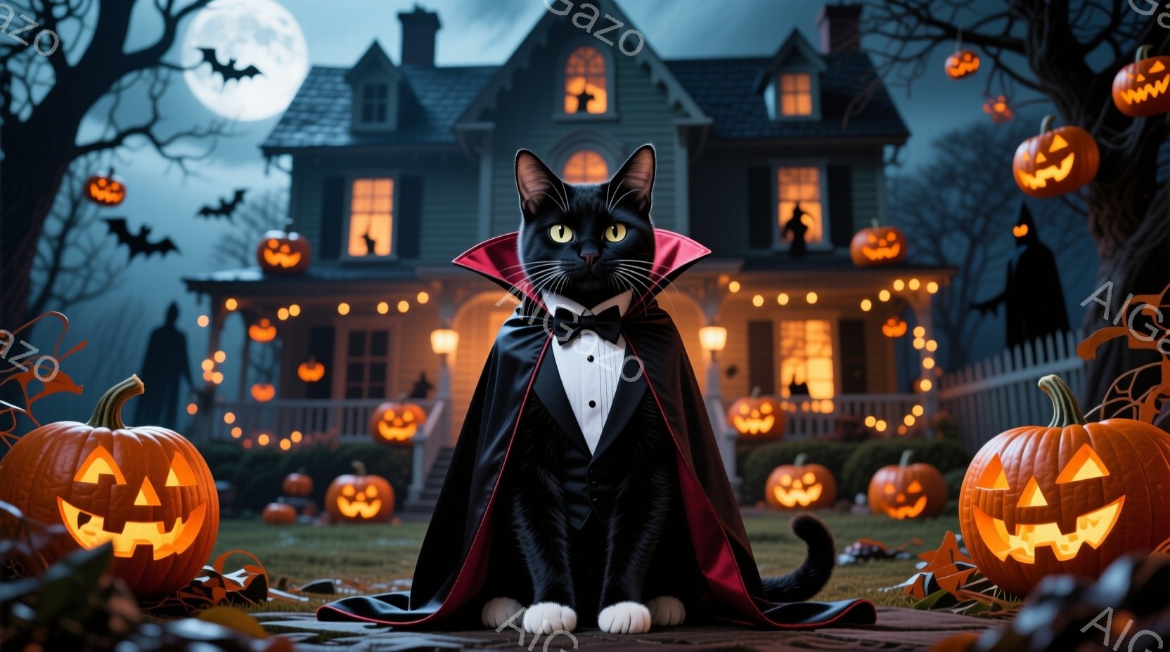 白黒の猫が、黒いケープと蝶ネクタイを身に着け、まるで吸血鬼のような姿で正面を見つめています。背景には、ハロウィーンの飾りが施された屋敷と、空には月とコウモリが浮かび、カボチャのランタンが並んでいます。全体的に不気味でありながらも可愛らしい、ハロウィーンの夜の雰囲気を感じさせる一枚です。